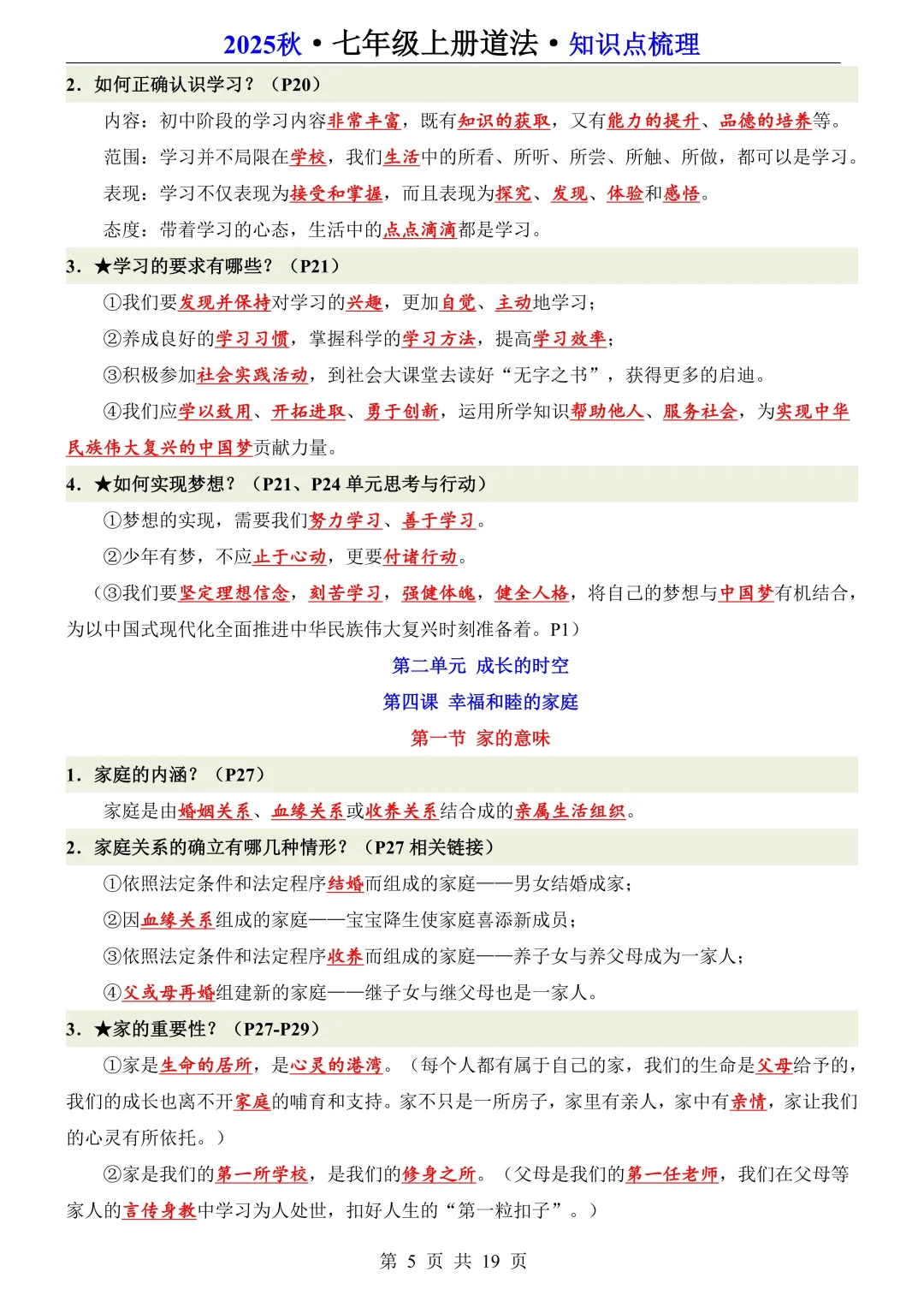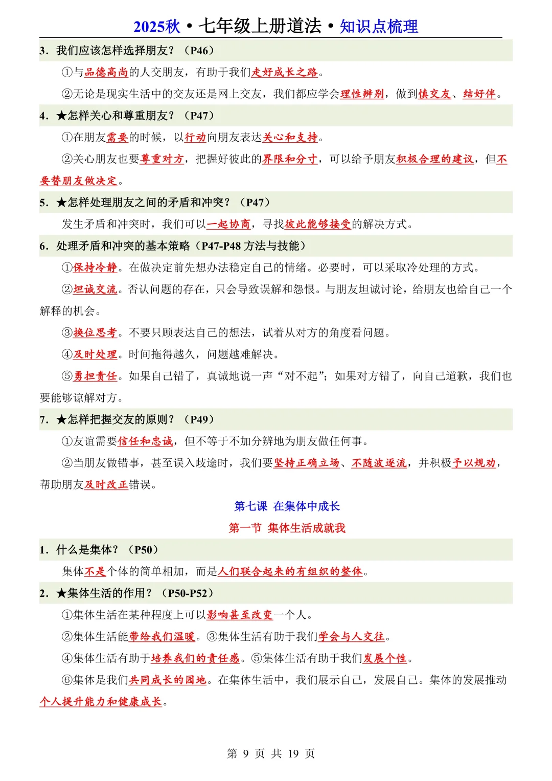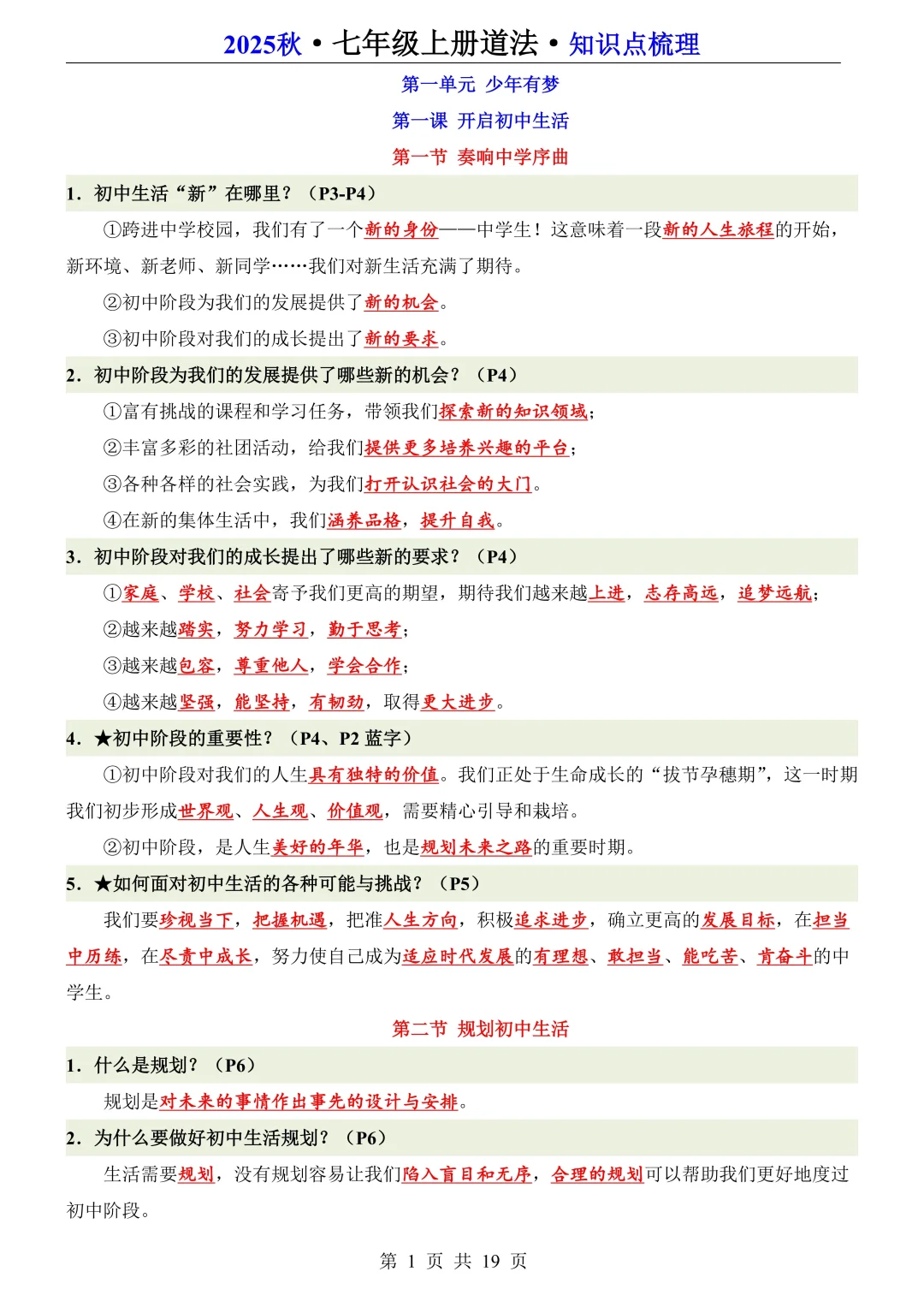 25新七年级上册道法全册知识点梳理