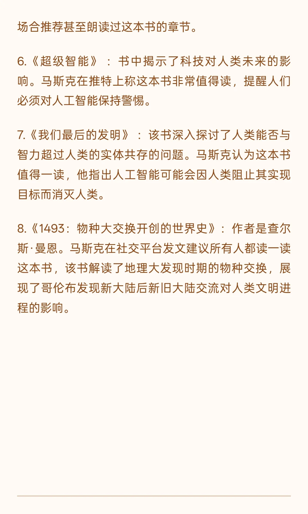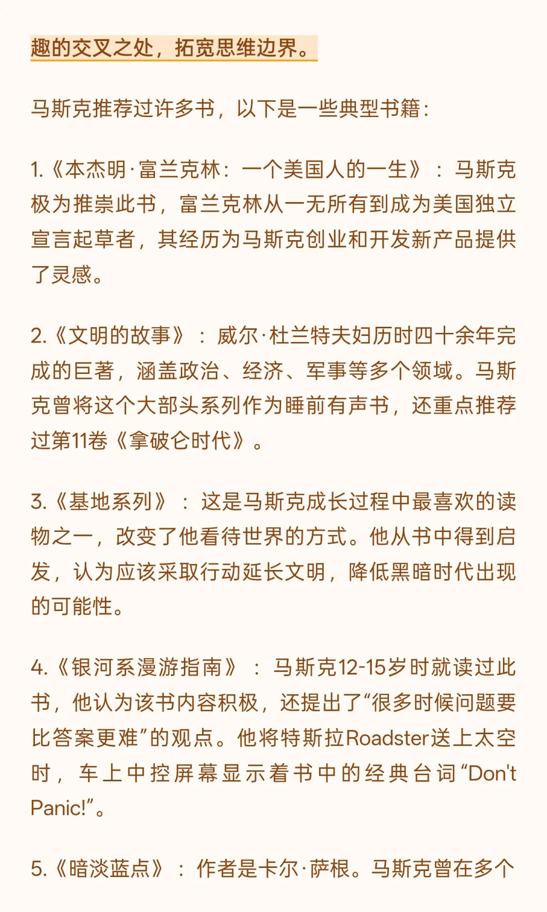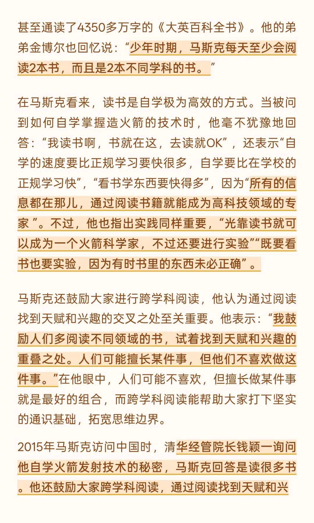 马斯克强调读书的重要性,将其视为成长和探索世界的关键。从小到大,他通过阅读找到安慰,自学掌握火箭技术。他鼓励跨学科阅读,认为这能帮助找到天赋与兴趣的交叉点,拓宽思维边界。