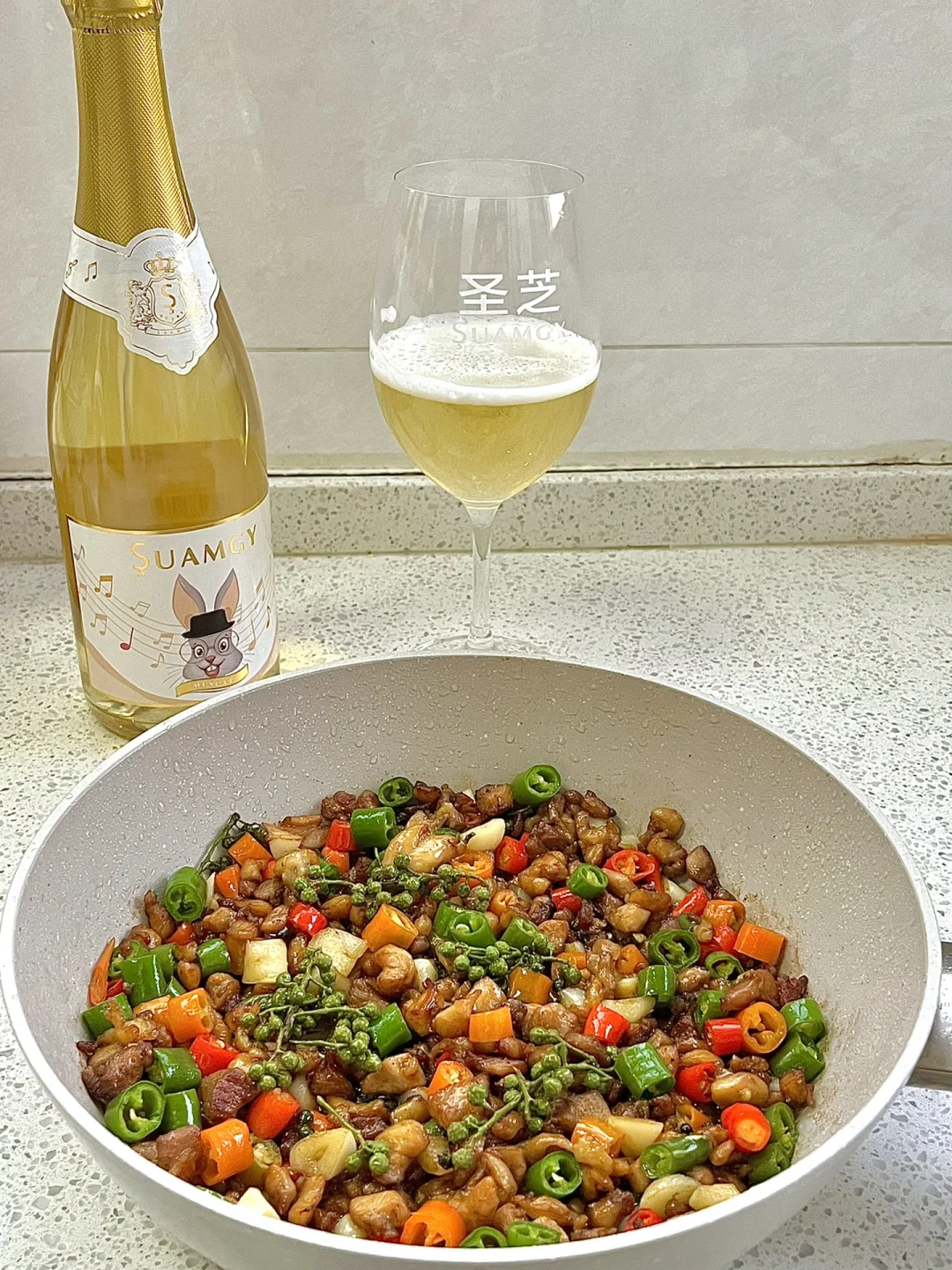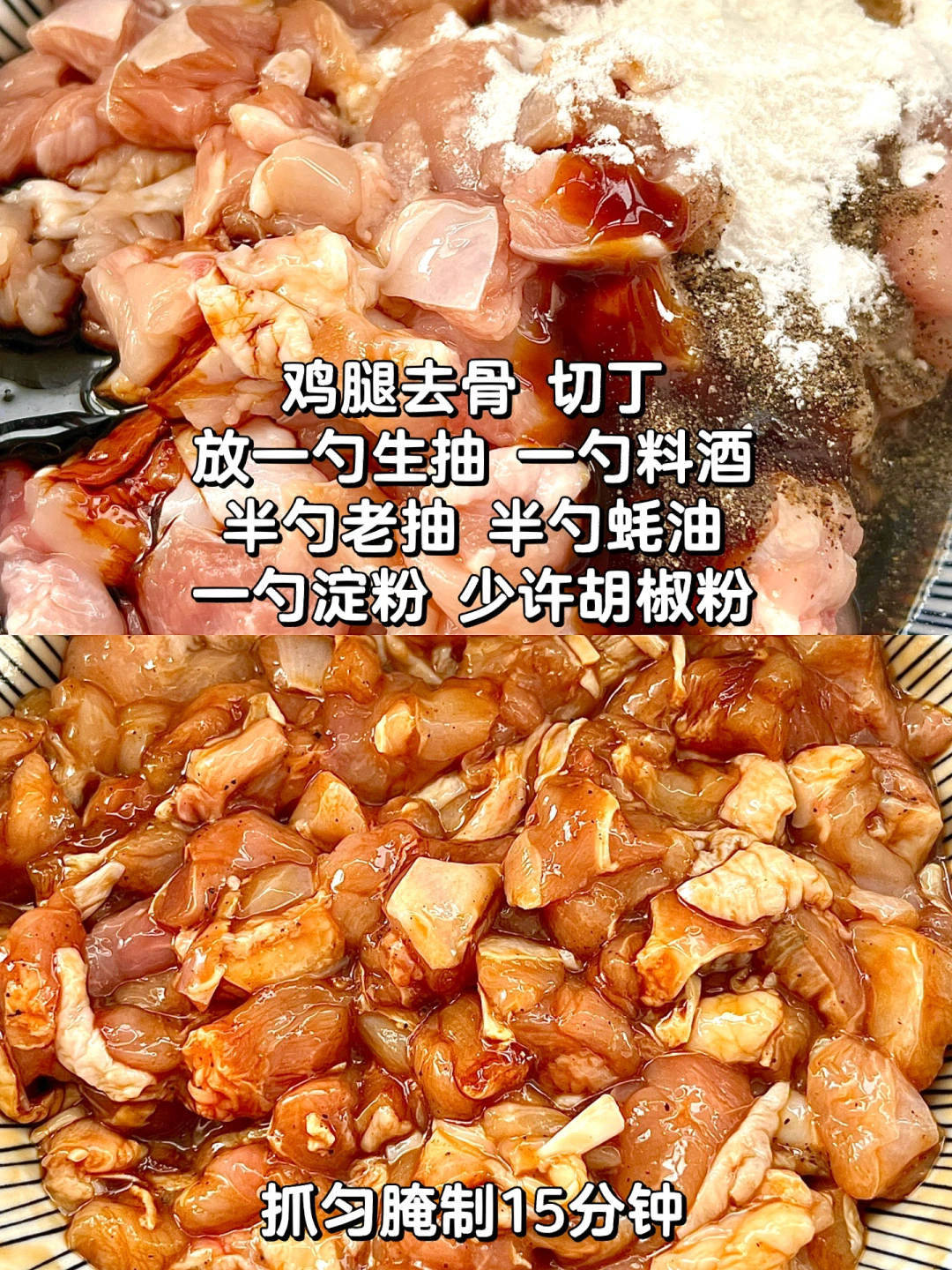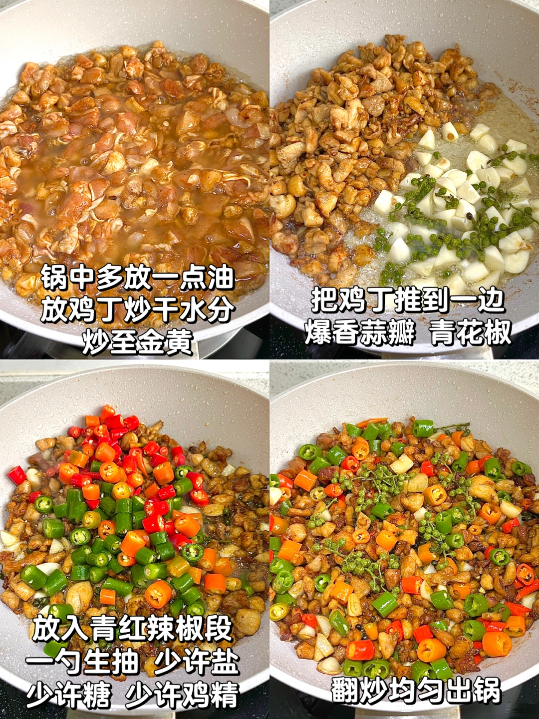 一碗米饭都不够!!双椒鸡丁也太香了!! - 🌟🌟食材: 鸡腿、青红辣椒、青花椒 🌟🌟步骤: 1⃣️鸡腿去骨、切丁,放入一勺生抽、一勺料酒、半勺蚝油、半勺老抽、一勺淀粉、少许胡椒粉,拌匀腌制15分钟 2⃣️锅中多倒一点油,放入鸡丁翻炒,炒干水分,至金黄,把鸡丁推到一边,放入蒜瓣、青花椒爆香 3⃣️放入青红辣椒段翻炒,放一勺生抽、少许盐、少许糖、少许鸡精✅ - 麻麻辣辣的鸡丁太下饭了!!拌饭真的一绝!!再配上圣芝莫斯卡托起泡酒!泡沫细腻!甜而不腻!