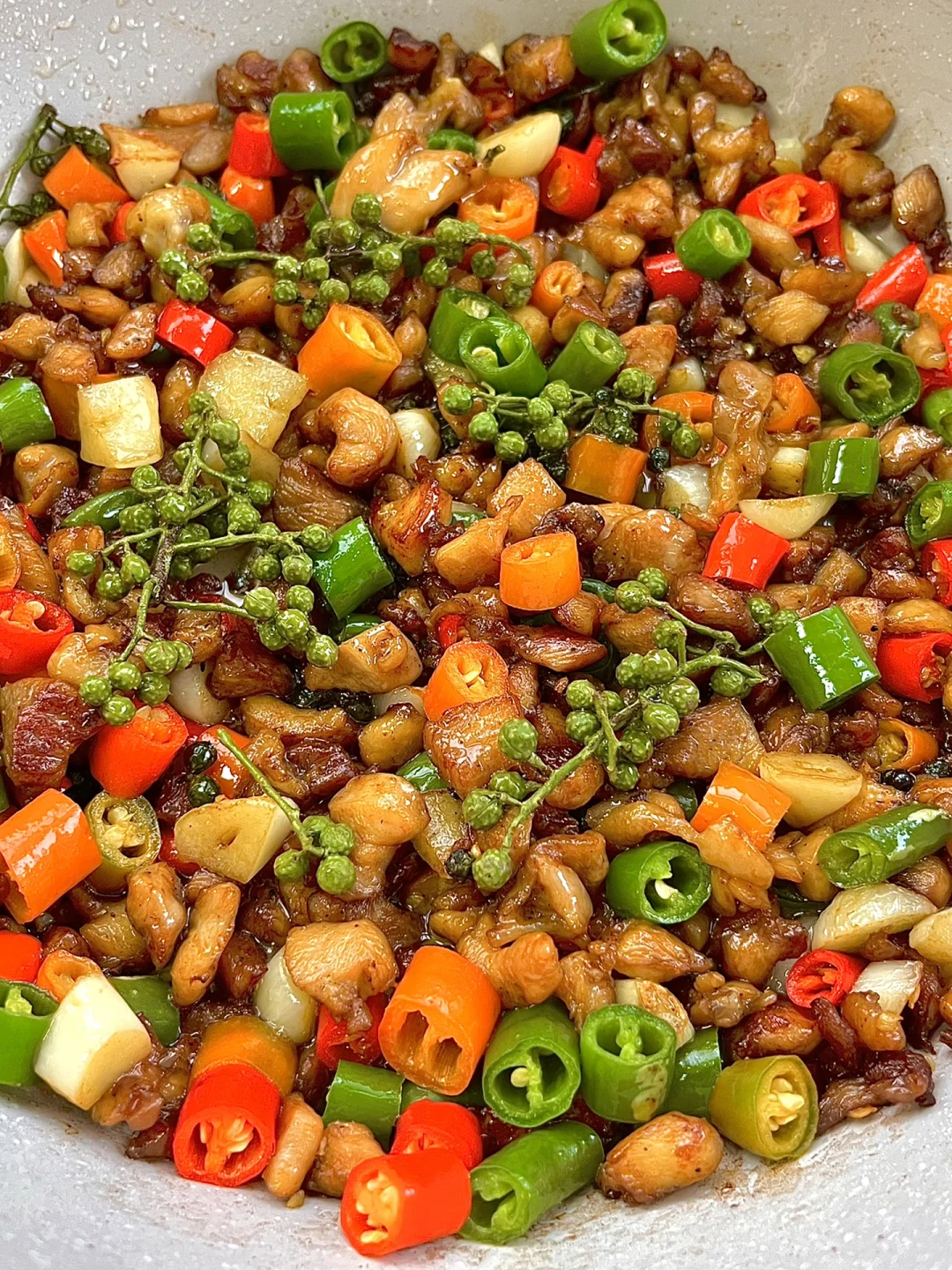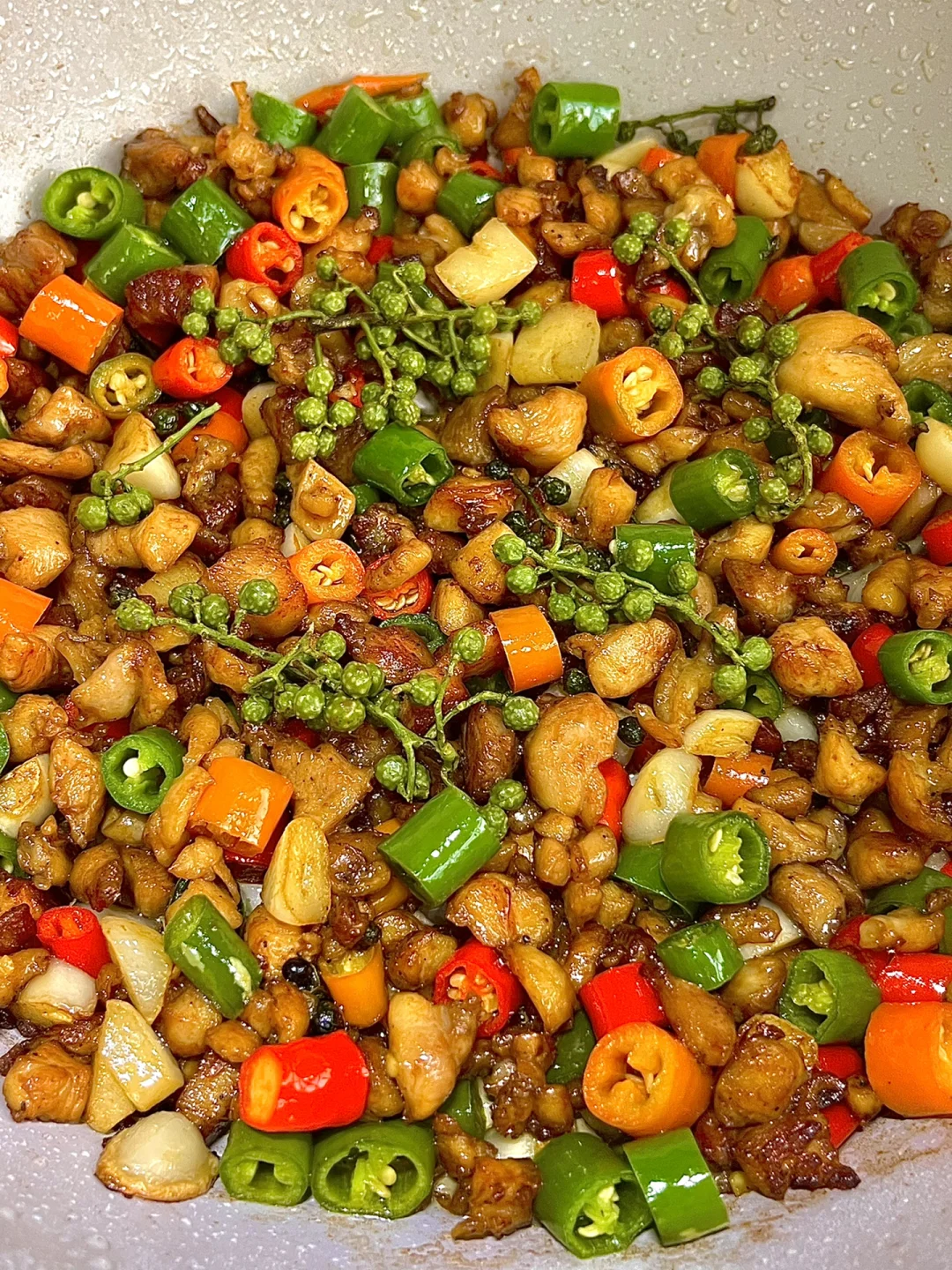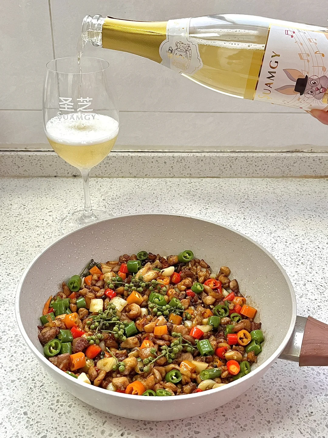 一碗米饭都不够!!双椒鸡丁也太香了!! - 🌟🌟食材: 鸡腿、青红辣椒、青花椒 🌟🌟步骤: 1⃣️鸡腿去骨、切丁,放入一勺生抽、一勺料酒、半勺蚝油、半勺老抽、一勺淀粉、少许胡椒粉,拌匀腌制15分钟 2⃣️锅中多倒一点油,放入鸡丁翻炒,炒干水分,至金黄,把鸡丁推到一边,放入蒜瓣、青花椒爆香 3⃣️放入青红辣椒段翻炒,放一勺生抽、少许盐、少许糖、少许鸡精✅ - 麻麻辣辣的鸡丁太下饭了!!拌饭真的一绝!!再配上圣芝莫斯卡托起泡酒!泡沫细腻!甜而不腻!