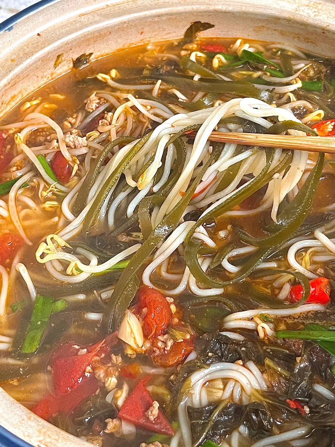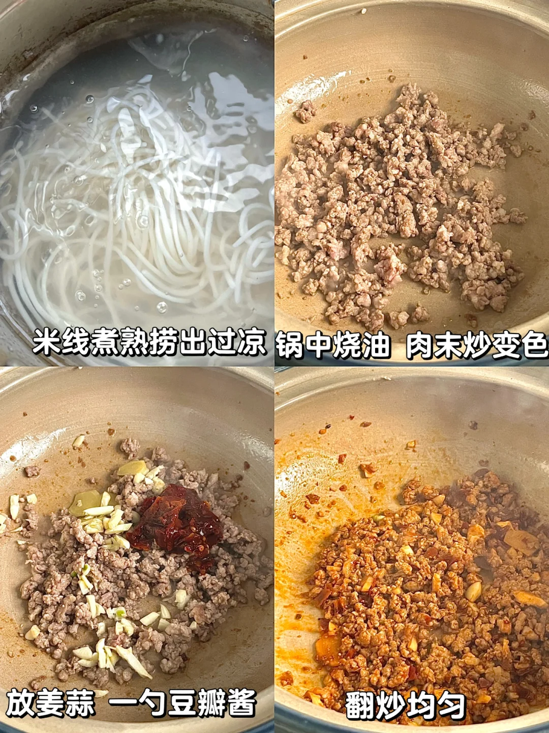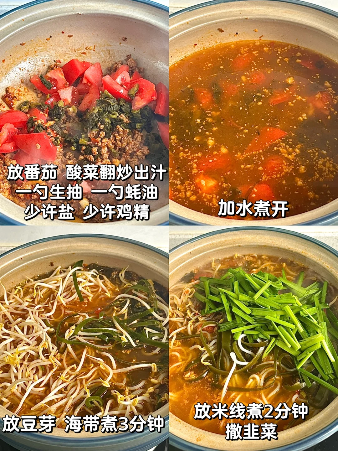 冬天来上这一碗米线不要太舒服!! - 🌟🌟食材: 米线、肉末、番茄、酸菜、豆芽、海带、韭菜 🌟🌟步骤: 1⃣️米线煮熟后捞出过凉,锅中烧油,放肉末炒变色,放姜蒜、一勺豆瓣酱翻炒 2⃣️放入番茄、酸菜翻炒出汁,加一勺蚝油、一勺生抽、少许盐、少许鸡精 3⃣️加水煮开后,放入豆芽海带煮3分钟,最后放入米线煮两分钟,撒韭菜✅ - 酸辣鲜香的酸菜肉末米线!!连汤都好喝!!