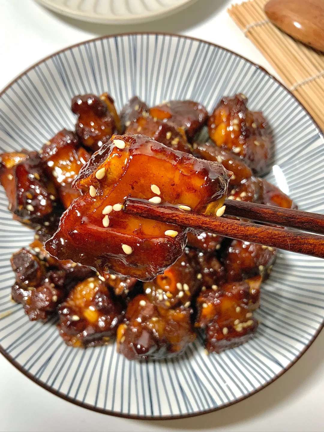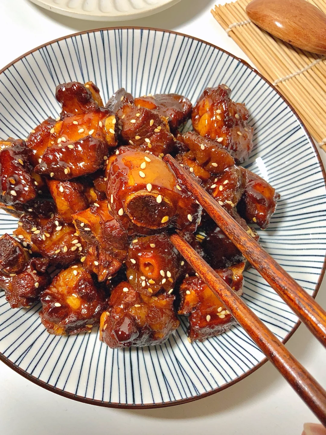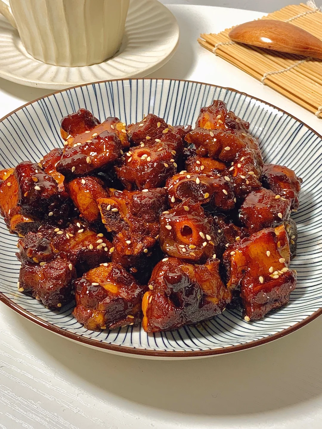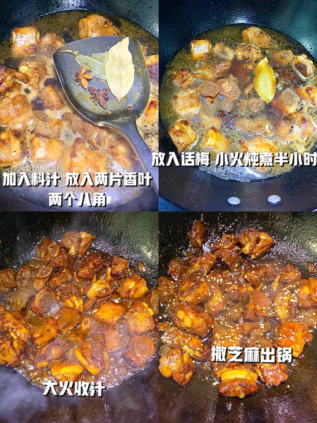 热的好吃😋凉的更好吃救命🆘比糖醋排骨味道还要好🥰 - 食材篇🥬: 猪小排、话梅6-8颗、香叶、八角、冰糖 步骤篇🥣: 1、排骨焯水洗净备用,话梅提前泡水,调料汁㊙️:生抽三勺、老抽一勺、蚝油一勺、醋一勺、少许盐、水250ml 2、锅中烧油,放入冰糖,小火炒出糖色,倒入排骨翻炒一会 3、倒入料汁炖煮,放入两片香叶、两个八角、8颗话梅,煮开后转小火炖煮半个小时 4、半个小时后大火收汁,撒芝麻出锅✅ - 香的不能行啊🥺刚出锅就被抢了一半👍剩下的留到第二天早上吃也特别好吃😋