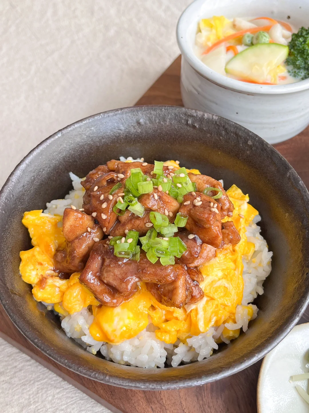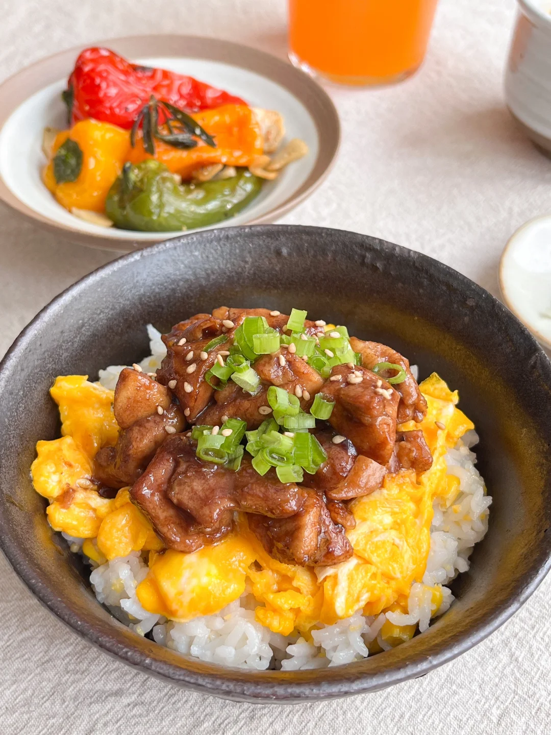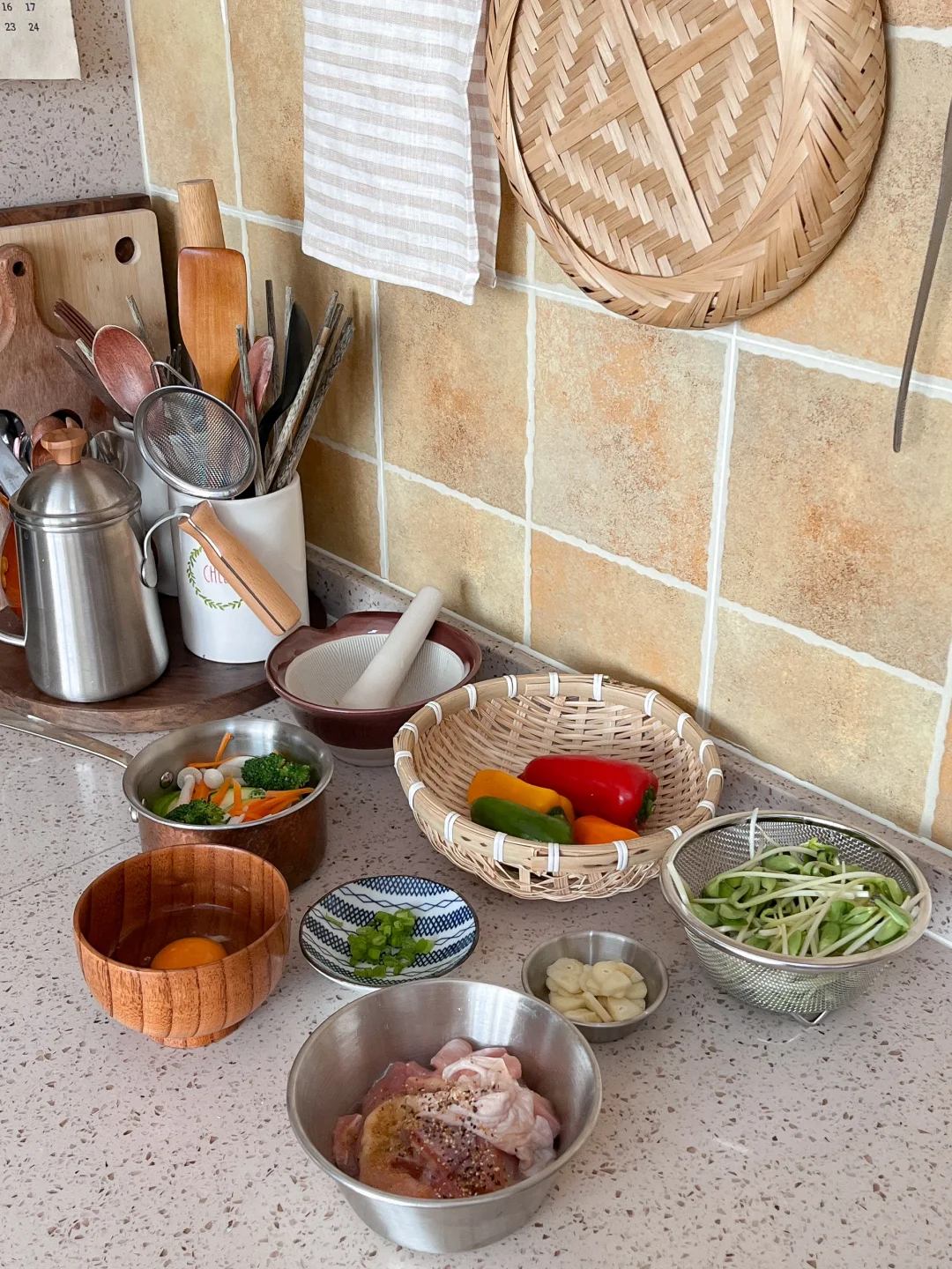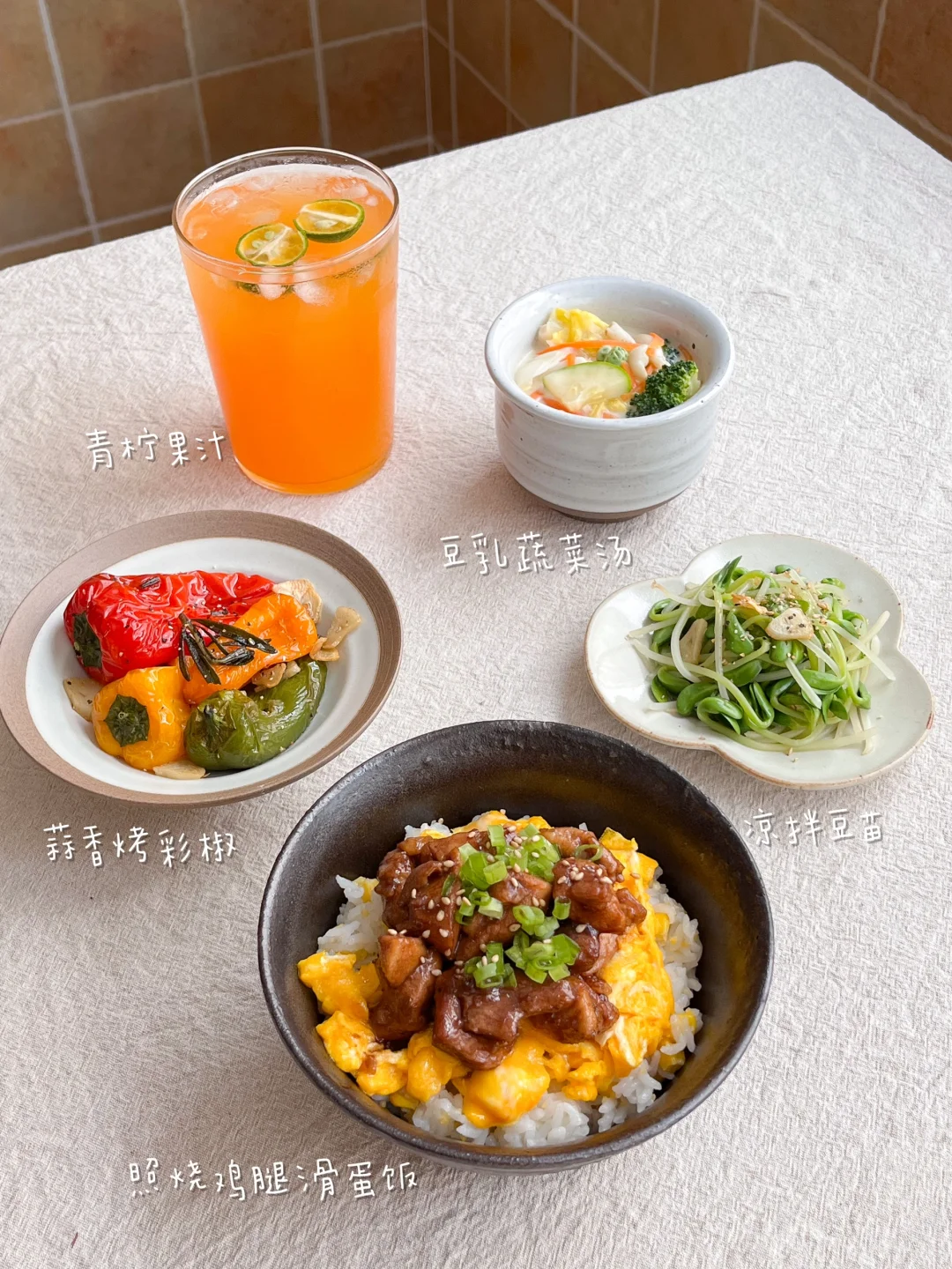 “春天就得吃点颜色丰富的蔬菜,今天在厨房里花点心思搭配了一下,吃彩色的食物真的会让心开心呢~” 今日午餐: 照烧鸡腿滑蛋饭🍗 蒜香烤彩椒🫑 凉拌豆苗🌱 豆乳蔬菜汤🍲 青柠果汁🧃