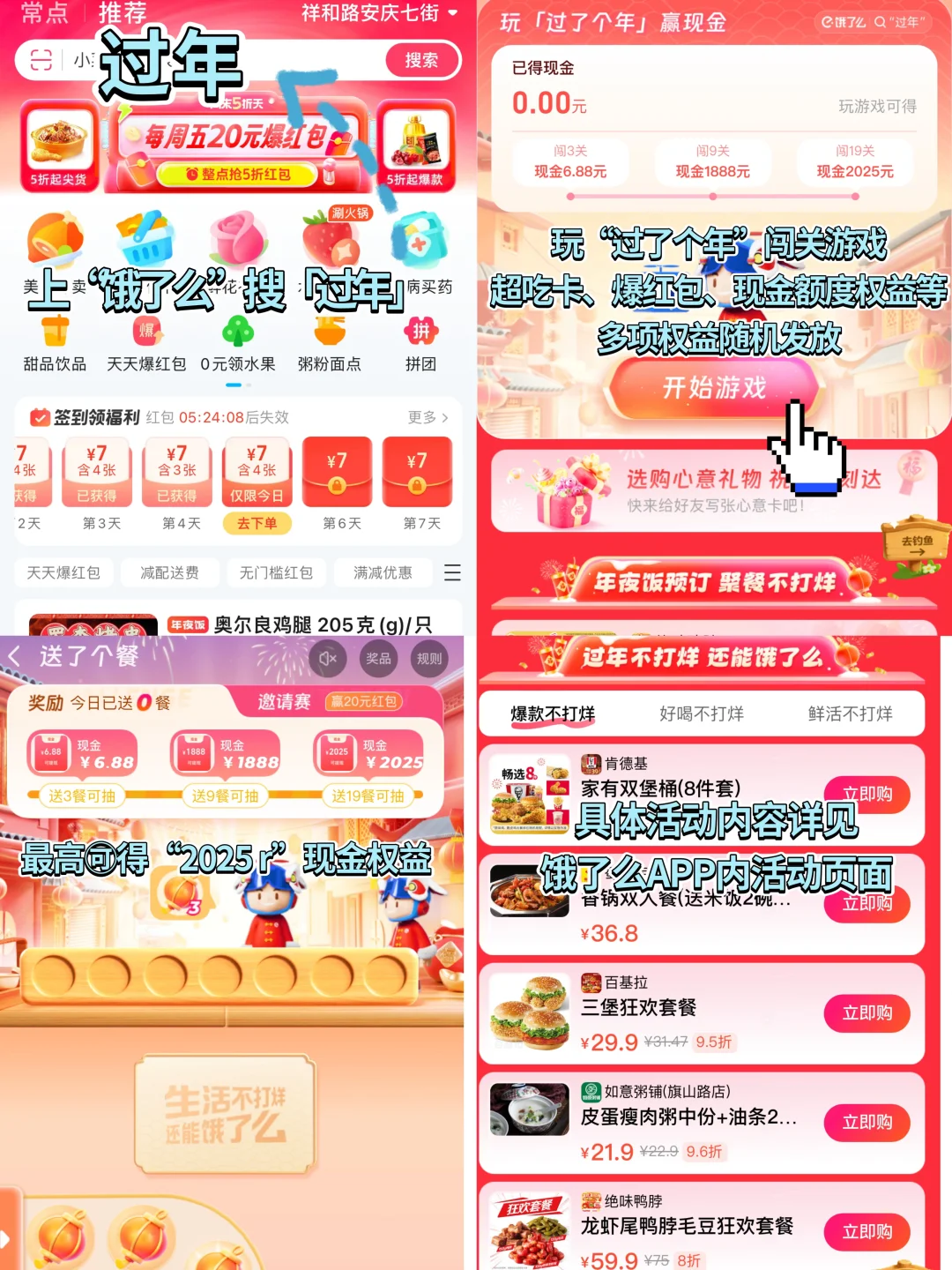 生活不打烊,过年上饿了么,不仅年夜饭有了着落,玩游戏还有机会赢福利,赶紧上饿了么玩“过了个年”,一起欢欢喜喜过大年!