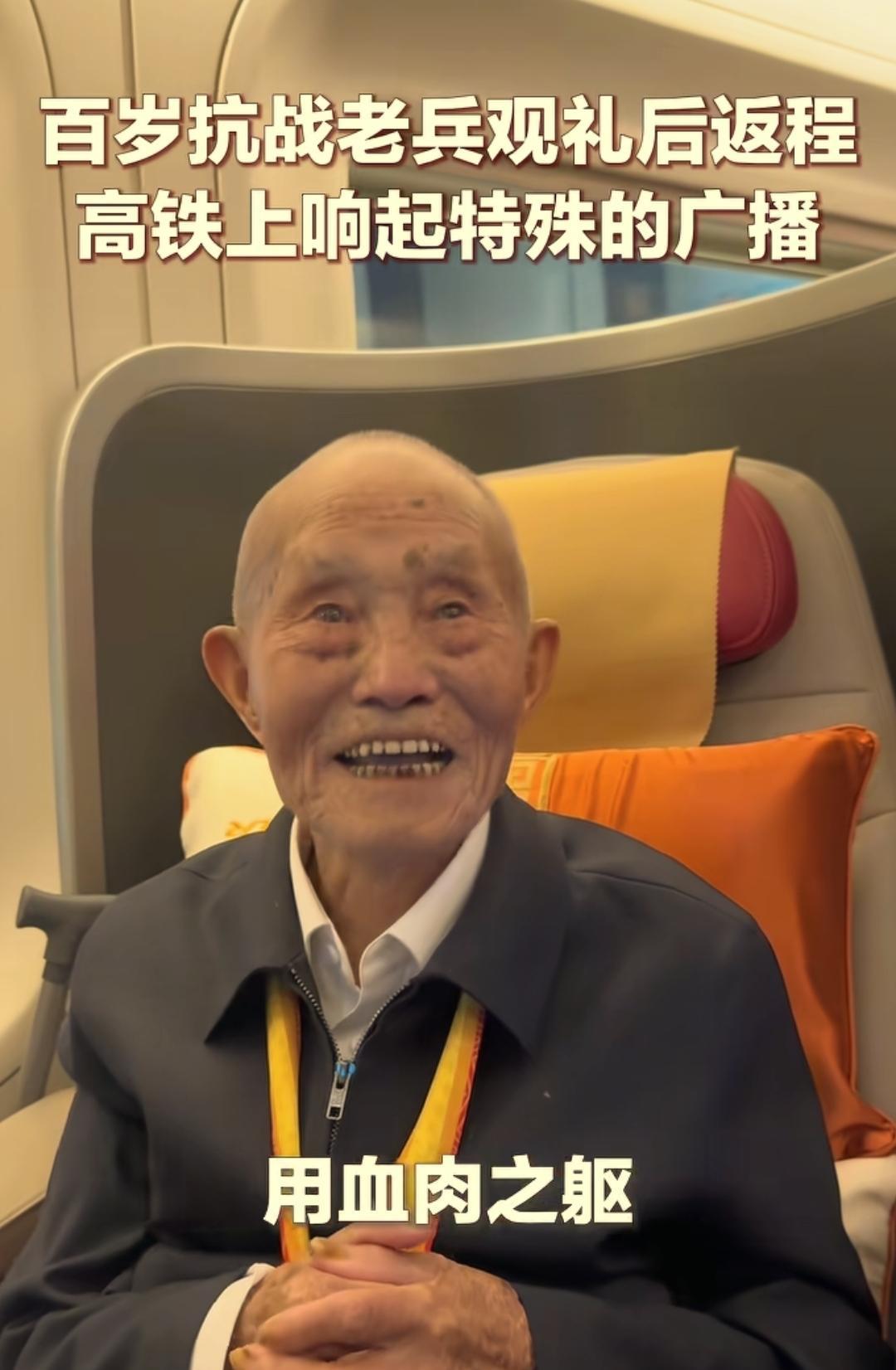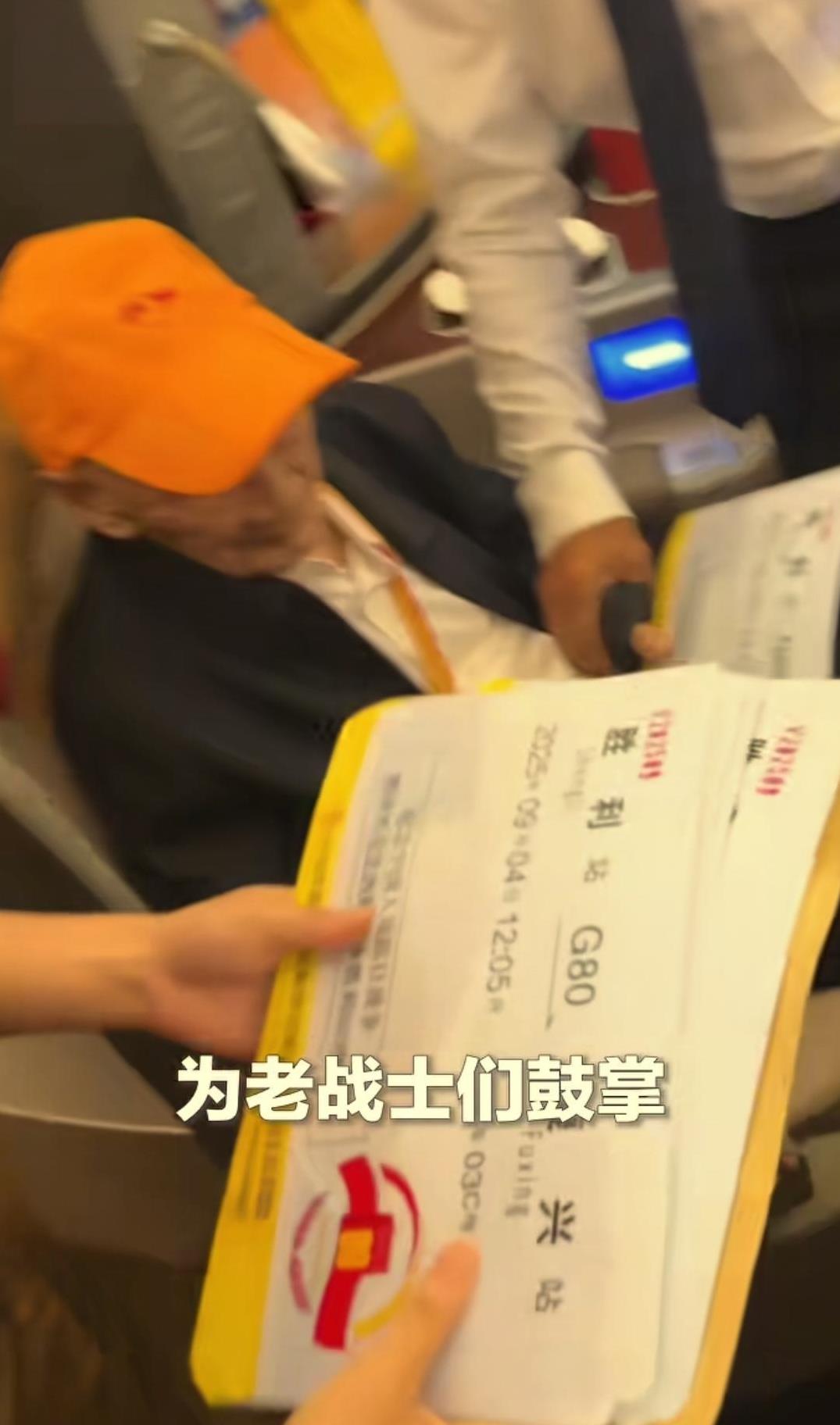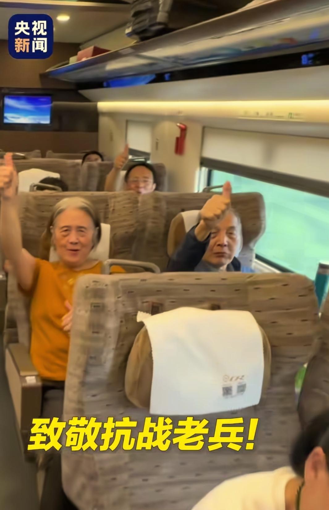 “火到央视新闻了!”一辆北京到武汉的高铁上,突然响起一则语音广播,乘客们本来在各忙各的,听到广播后,齐刷刷的回过了头。广播说道:让我们向两位特殊的乘客致以最 高的敬意,他们就是九三观礼阅兵的抗战老兵:宋其祥和刘吉祥! 列车员继续激动的介绍:80多年前,你们从湖北参军抗 日,用血肉之躯,筑起了钢铁长城,击退了敌人,现在,让我们一起,为老战士鼓掌! 广播结束,车厢里被激动的掌声淹没。两位老兵路过门口时,有人原本低头看手机,此时特意将眼镜往下压了压,坐直身子回头张望。有人原本打着盹,一下子睁大了眼睛。几位大叔大姨情不自禁竖起大拇指,眼神里写满了敬重。 为了不打扰老人,多数乘客选择远远注目,也有几位难掩激动的心情,悄悄上前拍照留念。 等两位老人坐稳后,列车员迫不及待的捧着几张特别定制的,放大版的高铁票上面,写着始发站地名是“胜利”,目的地的地名是“复兴”,列车的车次是G80。 这份车票的意义不用说,一目了然。列车员怕老人看不清,详细的介绍后,老人颤抖着手,拿着车票看了好一会,才贴心收好。 有网友说:突然羡慕这些乘客了,离英雄那么近。 也有网友说:从胜利站到复兴站,他们是亲历者,这张车票的目的地就是他们想要的。 最打动人的,不是雷鸣般的掌声,而是整个车厢那种激动而又克制的敬意,哪个乘客不想离英雄更近一点?可他们生怕打扰老人,从而选择远望,其实此时心里难掩激动。 而那张精心设计的概念车票,比任何勋章都更暖心。它告诉我们,所有人发自内心的记得就是最 好的致敬,是无数老兵当年的付出,换来了我们今日触手可及的幸福,他们值得任何形式的尊敬。