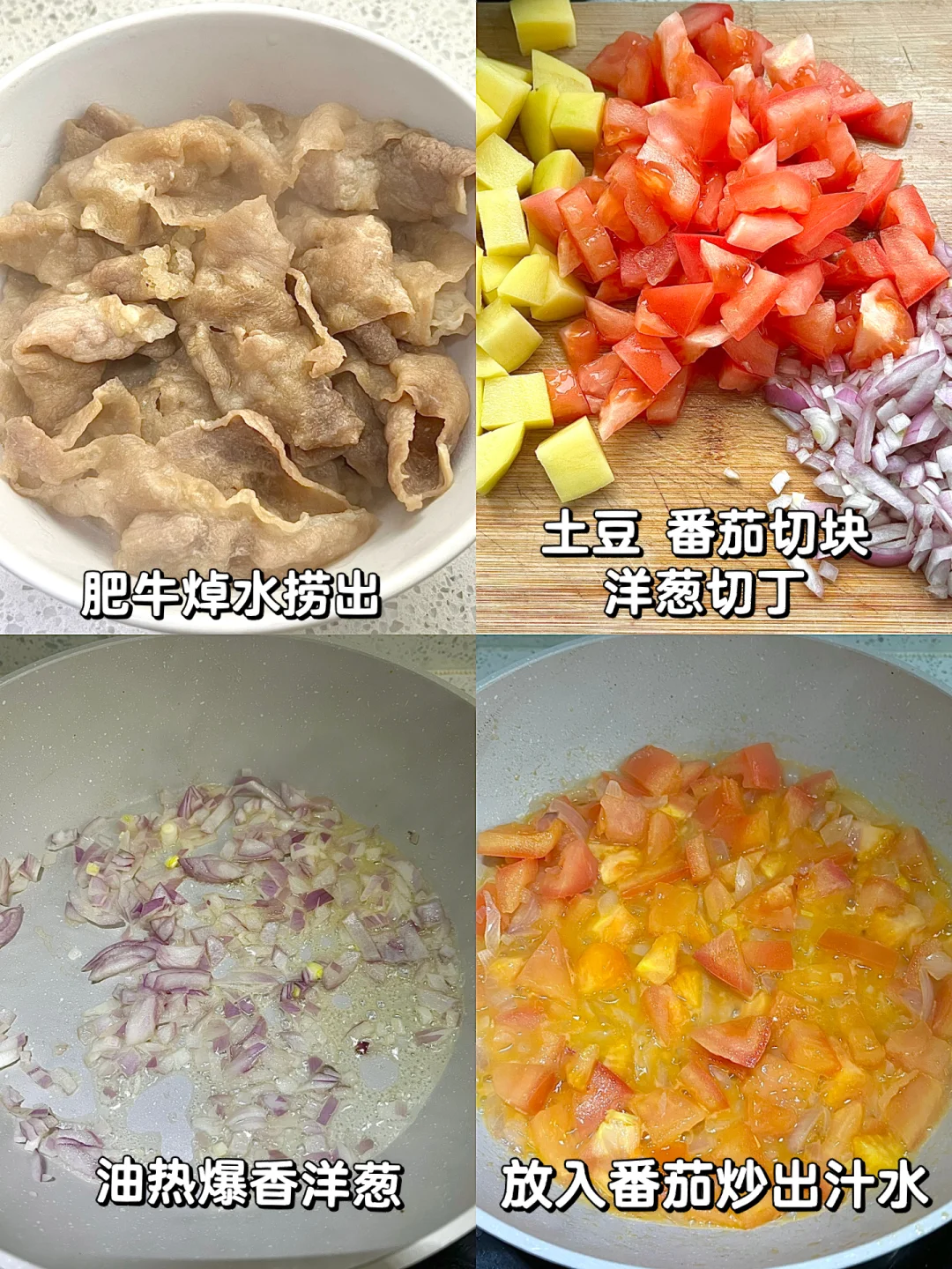 1⃣️肥牛焯水备用,番茄、土豆切块,洋葱切丁,锅中烧油,放入洋葱爆香