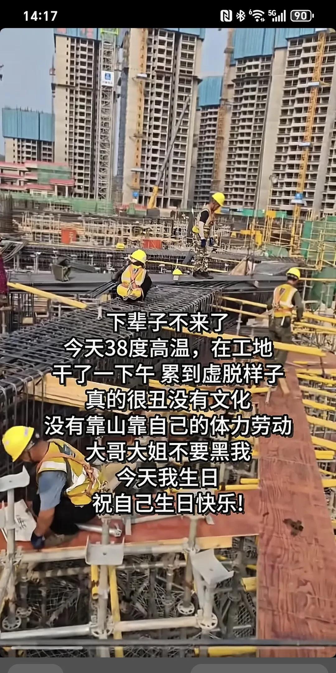 下辈子不来了,今天38度高温,在工地干了一下午,累到脱虚样子,真的很丑,没有文化,没有靠山,靠自己的体力劳动,大哥大姐不要黑我。今天我生日,祝自己生日快乐! 小美女,你是最美的,你在最美的年龄,用你最美的行动,为家庭,为孩子贡献自己最美的青春,为你点赞。 生日快乐!劳动最光荣、最伟大、最崇高、最美丽。致敬每一位劳动者。