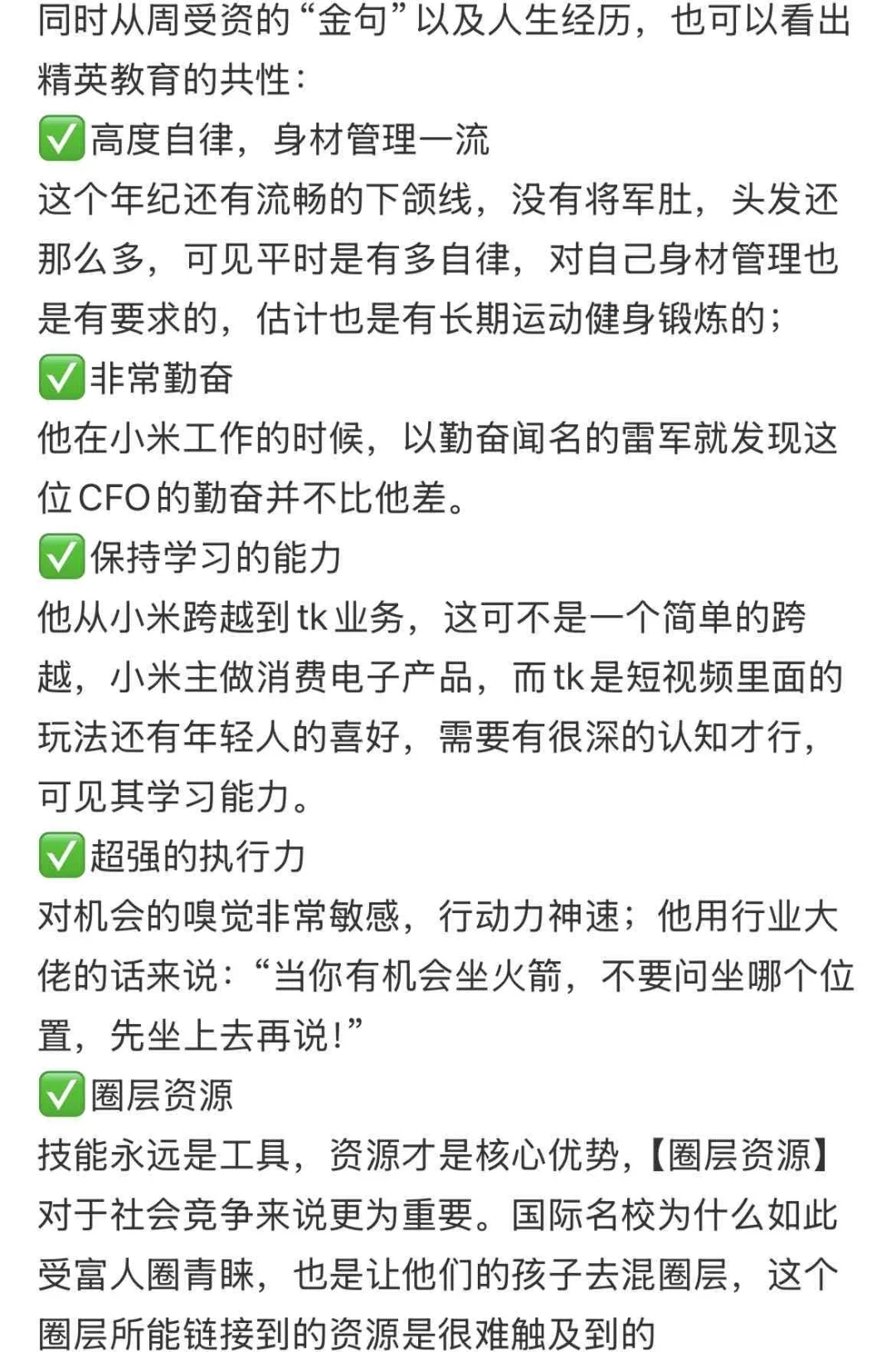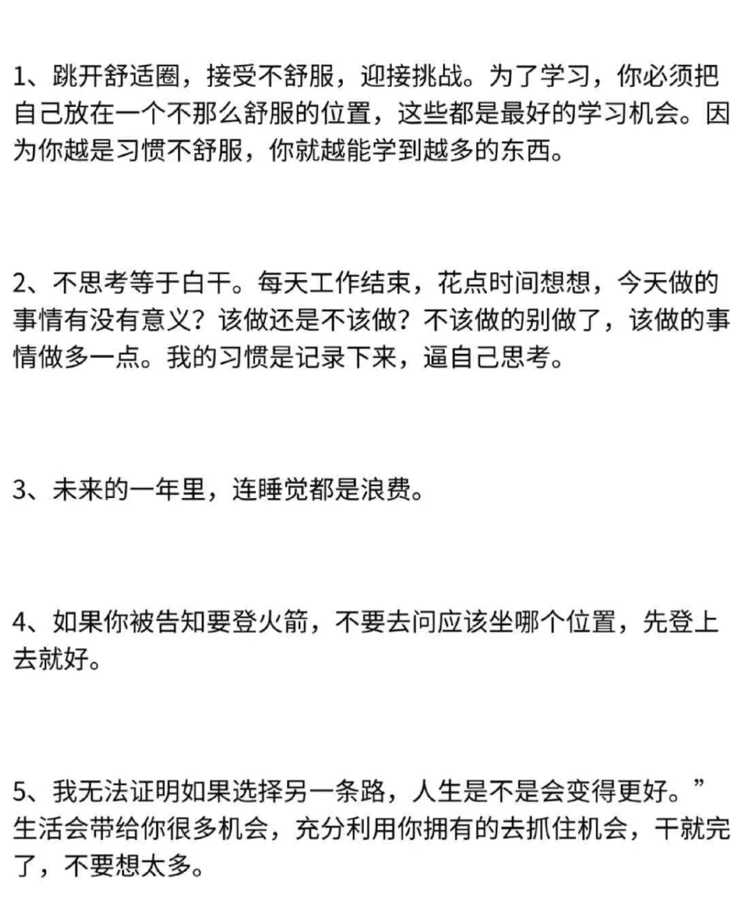 周受资:“ 1、跳开舒适圈,接受不舒服,迎接挑战。为了学习,你必须把自己放在一个不那么舒服的位置,这些都是最好的学习机会。因为你越是习惯不舒服,你就越能学到越多的东西。 2、不思考等于白干。每天工作结束,花点时间想想,今天做的事情有没有意义?该做还是不该做?不该做的别做了,该做的事情做多一点。我的习惯是记录下来,逼自己思考。 3、未来的一年里,连睡觉都是浪费。 4、如果你被告知要登火箭,不要去问应该坐哪个位置,先登上去就好。 5、我无法证明如果选择另一条路,人生是不是会变得更好。生活会带给你很多机会,充分利用你拥有的去抓住机会,干就完了,不要想太多。” 周受资 商业影响力 才华横溢的人 ——————🎄 看完周受资的采访和微博,发现他的工作方法,跟战术经典《孙子兵法》如出一辙呢,小小分享下: . [一R]先去全力体验人生 周受资说:“跳开舒适圈,接受不舒服,迎接挑战。”勇于尝试了才会知道喜欢什么,适合做什么,不要害怕尝试。 《孙子兵法》的核心思想是先胜后战!选择人生方向也是一样,因为喜欢,开局已经赢了一大半,剩下的只需要清楚3点,一风险,二代价,三利益,这叫谋定而后动。 . [二R]凡事要思考,先算后动 周受资强调了思考的重要性,他是每天会早晚会复盘工作计划和收获的人。他习惯用笔下来,逼自己思考。 《华杉讲透孙子兵法》里说凡事要先算后动,分析敌我力量对比,没有胜算,就不要动。“算”,即思考,非常重要。 . [三R]顺势而为,别硬拼! 周受资说“如果你被告知要登火箭,不要去问应该坐哪个位置,先登上去就好。”找到时代趋势,顺势很重要! 《孙子兵法》里说顺应天时地利,一件事,有时机才干得成,时机不对就不能干! . [四R]拼搏时,以过为直,以患为利,及时止损 周受资说“充分利用你拥有的机会,干就完了,遇到困难就解决困难,不要想太多。” 经历啥就处理啥,不要慌,塞翁失马焉知非福! 《孙子兵法》中有一条“以迁为直,以患为利 ”,华杉老师解释说,两点之间,因为有地形和敌情,表面上迂回的弯路,实际上是便利的直路,战术上方便易守难攻。 😌 周受资很强,国学经典里更是超多宝藏。希望大家都能从大佬的人生智慧中有所收获,找到自己人生的方向~ [种草R] smart is new sexy! 欢迎关注,这里会: [一R]日更闪光金句/经典书摘 [二R]来这世间一趟,要看看太阳呀 [三R]适度思考,链接现实,好好开干!