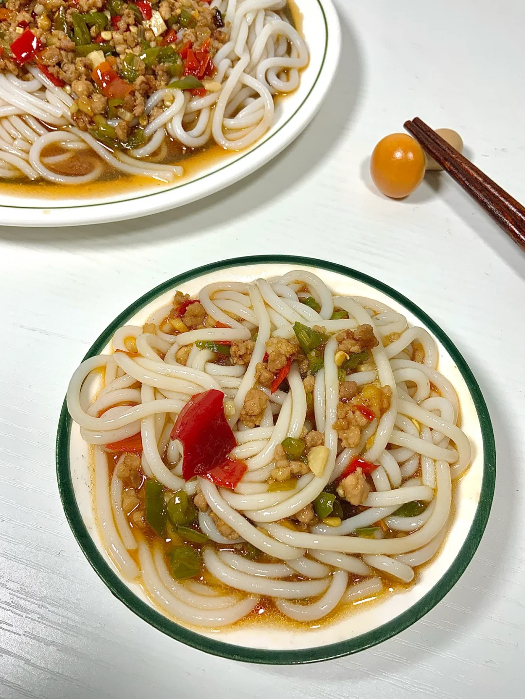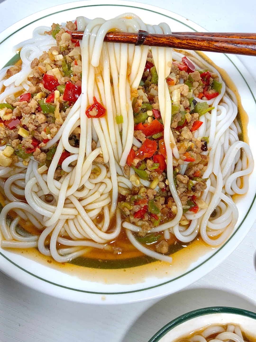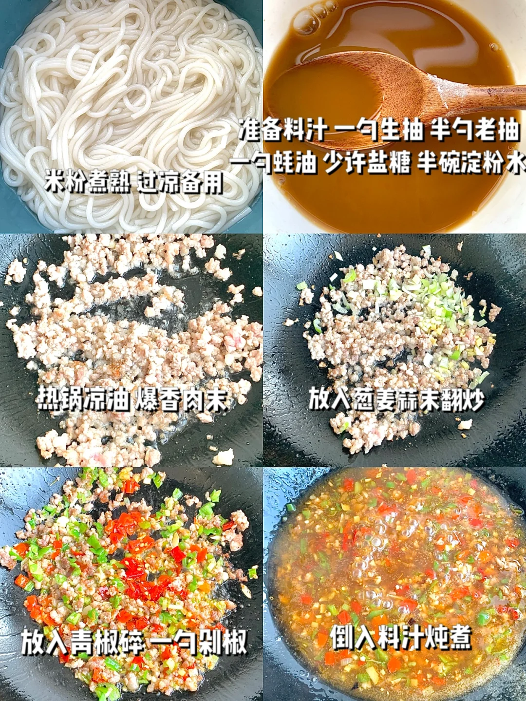 嗦粉狂魔最爱的一碗粉🥺剁椒肉酱拌粉🍝超级快手简单✅超级好吃😋 食材篇🥬: 剁椒、肉酱、青椒 步骤篇🥣: 1、米粉煮熟,捞出过凉备用,热锅凉油,爆香肉末 2、放入青椒碎、一勺剁椒,一起翻炒两分钟 3、放入调料汁㊙️:一勺生抽、半勺老抽、一勺蚝油、少许盐、糖、半碗淀粉水 4、将酱汁淋入米粉中,拌匀,完成✅ - 香辣开胃的剁椒肉酱米粉🍝好吃到爆🥺嗦粉忍最爱的一碗粉🥺