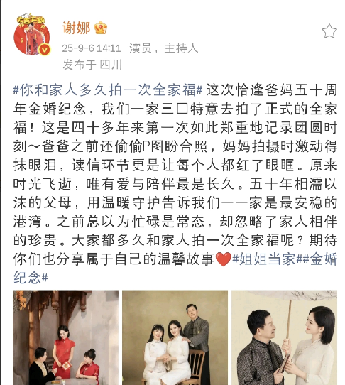 原来,谢娜一家人一起去拍了全家福!她写道:“这次恰逢爸妈五十周年金婚纪念,我们一家三口特意去拍了正式的全家福。”拍摄过程中,谢娜妈妈激动落泪,尤其是在读信环节,温暖的回忆与真挚的祝福,让现场每个人都红了眼眶。