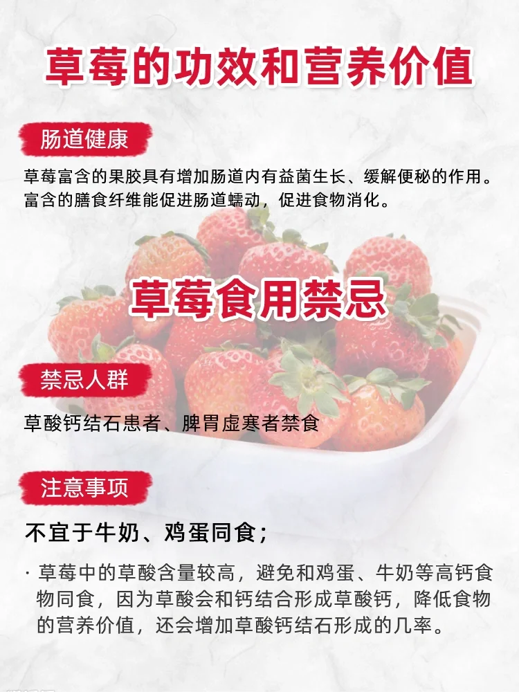 ·草莓中的草酸含量较高,避免和鸡蛋、牛奶等高钙食物同食,因为草酸会和钙结合形成草酸钙,降低食物的营养价值,还会增加草酸钙结石形成的几率[石化R]