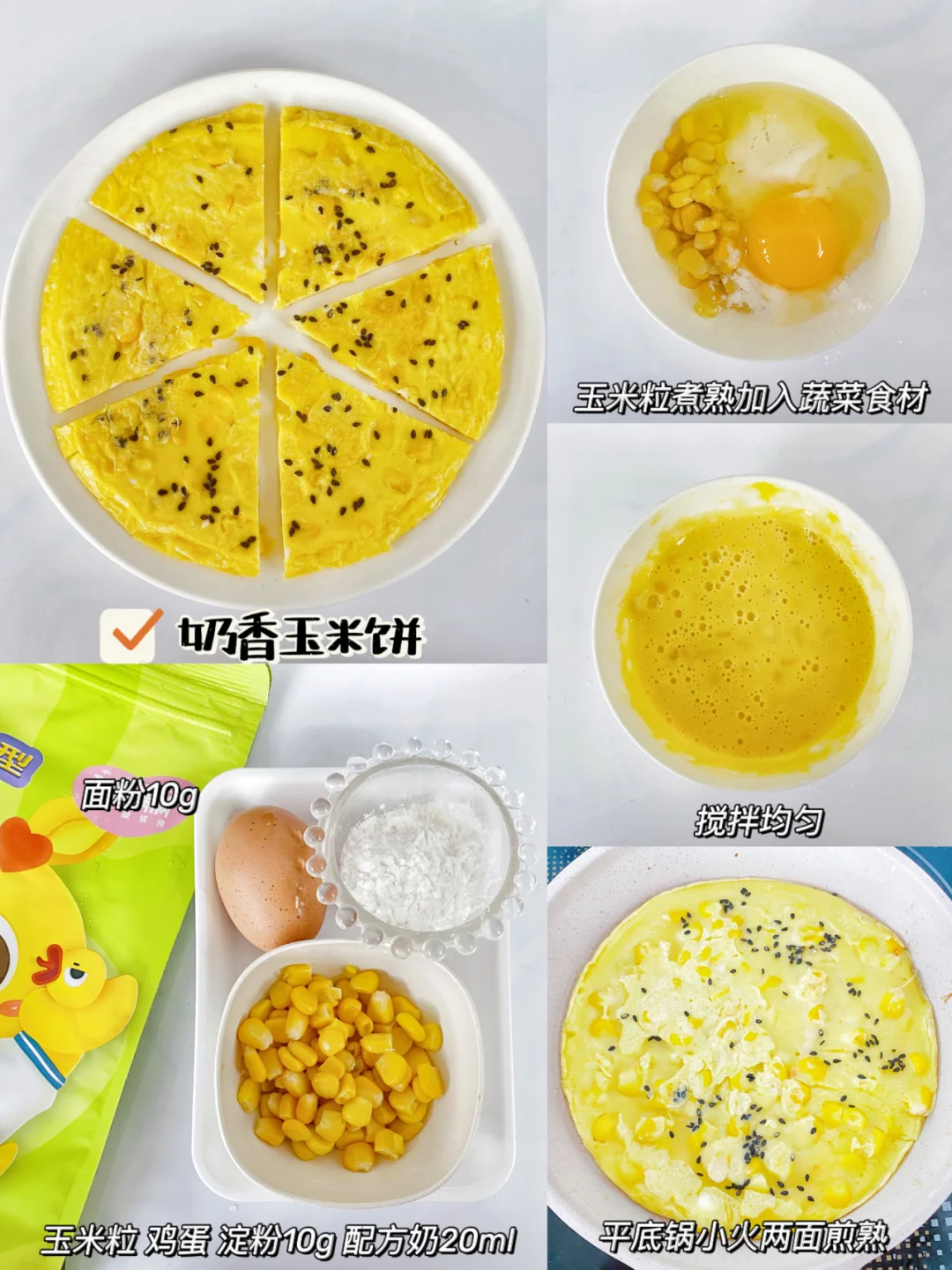 熟玉米粒、鸡蛋、玉米淀粉10g、面粉10g、配方奶20毫升