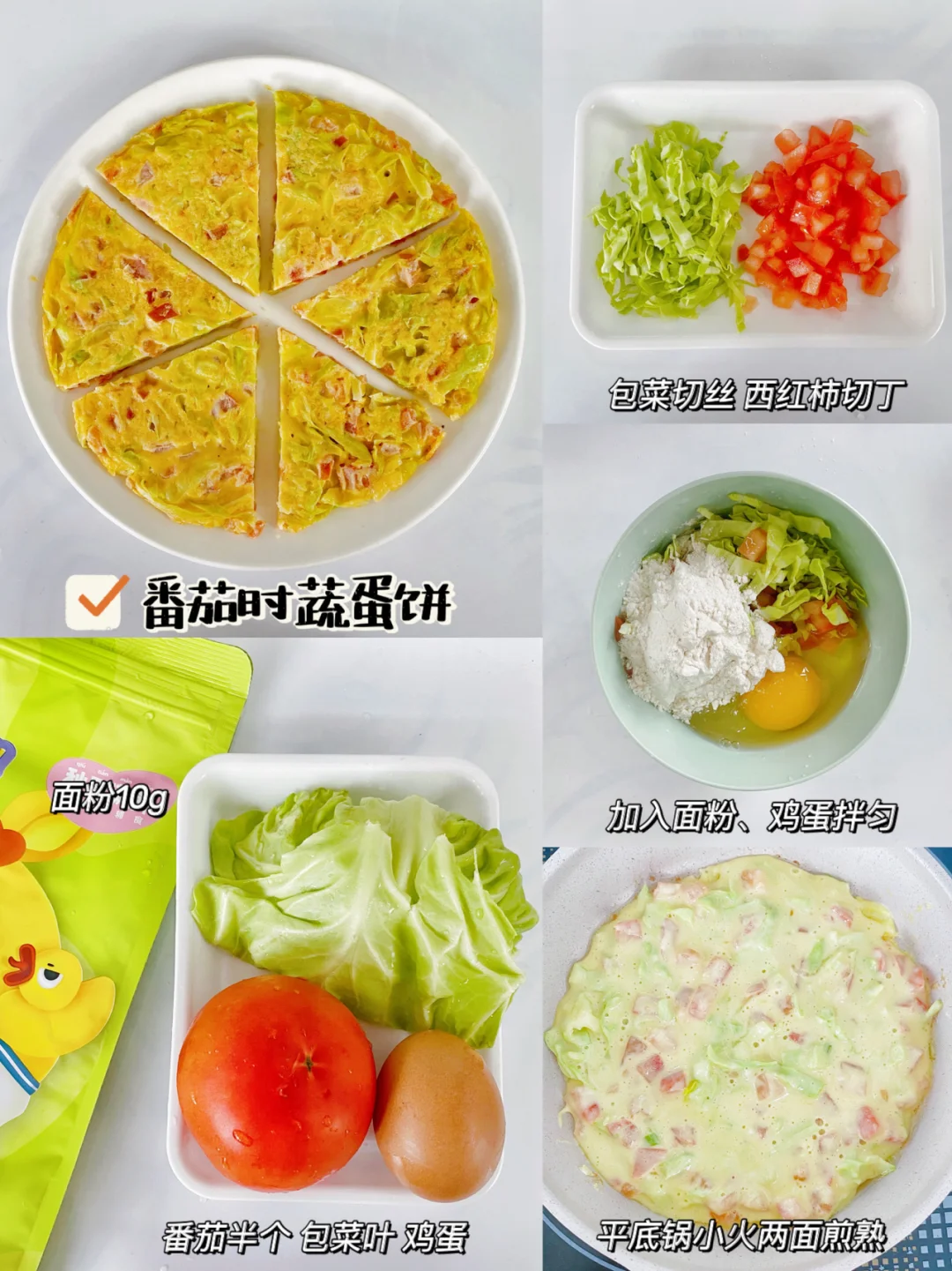 西红柿切小丁、包菜切丝。加入面粉、鸡蛋搅拌均匀。平底锅刷油全程小火两面煎熟即可。