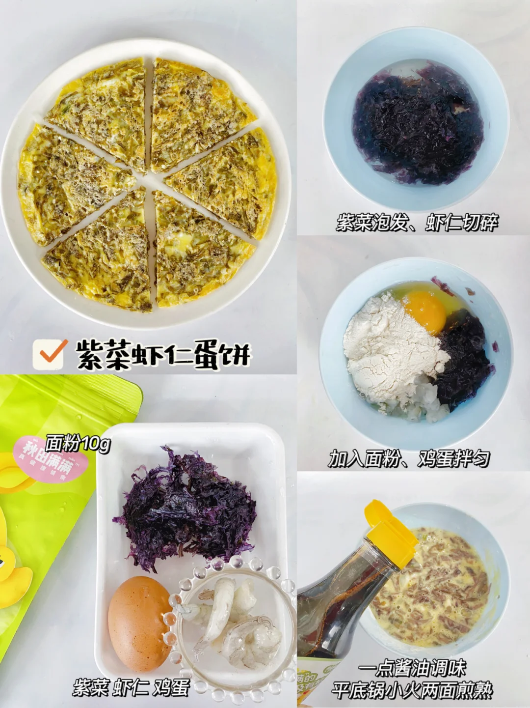紫菜泡发、虾仁切碎。加入鸡蛋、面粉,一点酱油调味。平底锅刷油全程小火两面煎熟即可。