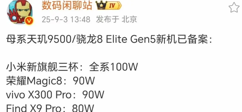 小米是100W、荣耀Magic8系列是90W、vivo X300 Pro是90W、Find X9 Pro是80W