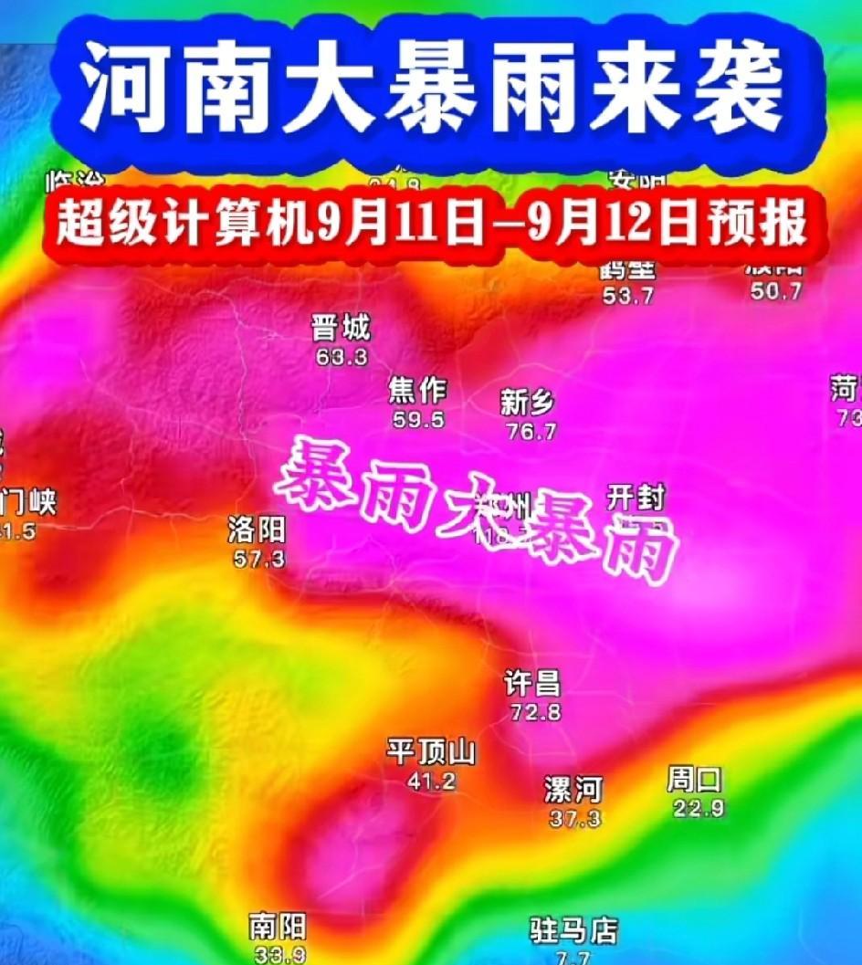 在我们这里,这个季节下大雨、暴雨,我很少经历过。 就在刚才,我看到气象云图上显示,河南黄淮流域有大雨暴雨,局部还有特大暴雨,并伴有强对流天气。 从气象云图上看,9月11号至12号,雨层已经全覆盖整个黄淮流域,图片标注的蓝色是暴雨,红色是特大暴雨,这雨势来势凶猛,一定要注意防范。