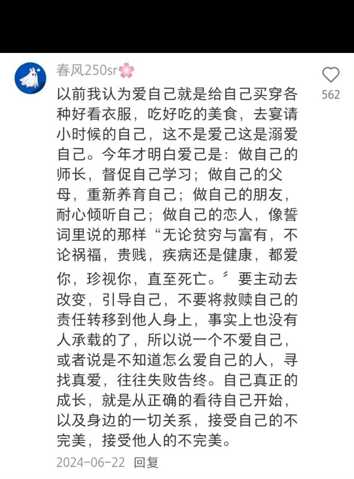 突然对“爱自己”有了新感悟~ 以前总觉得对自己好就是买漂亮衣服、吃美食… 现在才明白,真正的爱自己,是把自己当白月光一样夸赞、打扮。 更是好好疼惜自己,是做自己的师长督促学习,做自己的父母重新养育,做自己的朋友耐心倾听,做自己的恋人坚定守护。 毕竟,自己才是陪自己最久的人,好好爱自己,才能更好地爱生活呀~ #晒图笔记大赛#
