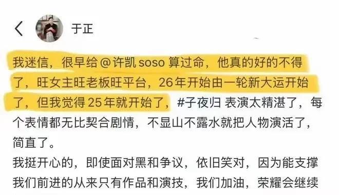 于正大义,凭借一己之力把许凯扛出了废墟,舍己为他,就算丢了自己的清白和名声,就算伤了何晟铭的名誉和心情,也在所不惜。毕竟许凯是他义无反顾的赌注和偏爱。自己家的女艺人就算和许凯谈了个遍,在于正眼里,也不过就是逆子爱玩,果然被偏爱的有恃无恐。在欢娱能的于正偏爱的,大概只有吴谨言和许凯了。 只要互联网不断有新的瓜出来,许凯这件事就会不了了之,逐渐被淡忘,互联网不会断,但是看互联网信息的人会善变。想遗忘随时随地可以翻篇。