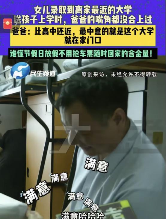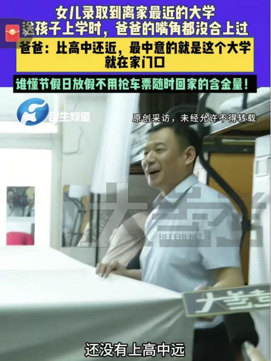 河南郑州,一女孩被录取到离家仅需二十分路程的一所大学,9月5号开学这天,父母来送女孩上学时,这爸爸就因女孩学校离家很近,全程高兴得嘴角就没合上过。 “爸!您收敛点,嘴都笑歪了!”女儿开学这天,父亲脸上的笑容格外的灿烂,当无数家庭在为一张遥远的录取通知书欣喜,又为即将到来的离别伤感时,郑州的这位父亲,嘴角都没合过! 在郑州的某大学门口,报到的新生人山人海,那些拖着行李箱、背着行囊的年轻面孔们,眼神里写满了对未来的憧憬和一丝离家的忐忑。然而,人群中却有一家人显得格外与众不同,尤其是走在中间的父亲,他的笑容从下车起就没消失过。 “瞧你爸高兴地,跟中了头彩似得!”面对母亲的调侃,父亲脸上的喜悦更加藏不住了,他环顾着校园,眼神里全是满意。原来,他们一家居住在东西区中间,东区是女儿上高中的地方,西区则是大学,而且,离家更近。 据了解,这个大学距离他们家也就仅仅二十分钟的车程。早在填报志愿时,这就成了全家人心照不宣的首选目标,成功录取的消息传来时,家里的聊天群就被“放鞭炮”和“撒花”的表情包刷了屏! 此次前来送女儿开学,家里一共来了5个人,阵容堪称“豪华”,母亲的脚步轻快,利索的帮着铺床、挂窗帘,把洗漱用品一一归位,动作间满是踏实和安心;一个小小的床帘,五口人齐上阵。 这近在咫尺的幸福,很快在网络上引发了热议,无数网友投来羡慕的目光。不少人表示:这简直是理想中的上学距离,拥有了独立的大学空间,又保留了家的温暖港湾,想当初,自己上大学,光车程就需要三十多个小时,还是硬座! 不过,这之间也有不同的看法:他们认为年轻人就应该出去闯闯,见识更广阔的世界,对自己的人生有更加明确的定位。 当报到手续办完时,一家人准备离开,一个简单的拥抱,没有繁琐的叮嘱,没有伤感的离别,个个都笑容满面,因为他们知道,再见面的日子,就在不远的周末。这触手可及的团圆,对于父亲而言,是更踏实的幸福感。 其实,独立成长的关键,从来不是地理上的远近,而是心灵是否开始学会对自己负责,能常伴父母身边,能享受家的温暖,同时能追逐自己的梦想,这何尝不是一种令人羡慕的人生道路。 对此,您是怎么看待这件事的呢?您或者儿女开学时,当时是怎样的感受呢? 信息来源: 河南广播电视台民生频道|《9月5日,河南郑州,女儿录取到离家最近的大学,送孩子上学时,爸爸的嘴角都没合过,爸爸:比高中还近,最中意的就是这个大学,就在家门口,谁懂节假日放假不用抢车票随时回家的含金量!》 文|梅林 编辑|南风意史
