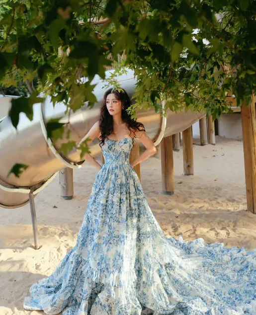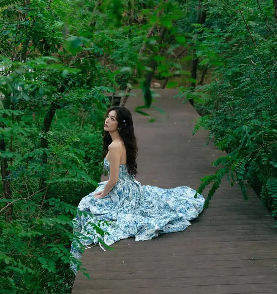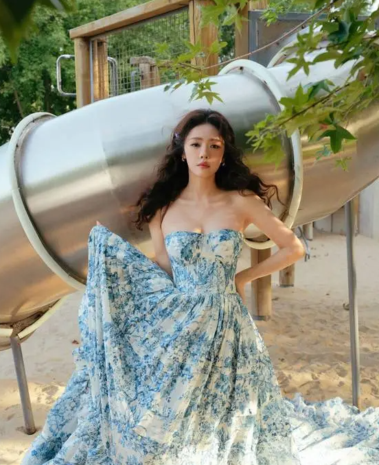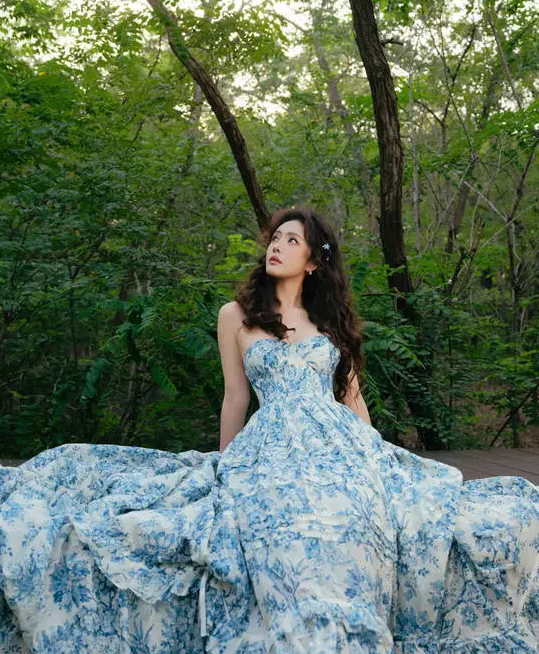 蔡文静穿青花瓷国风礼裙清新靓丽