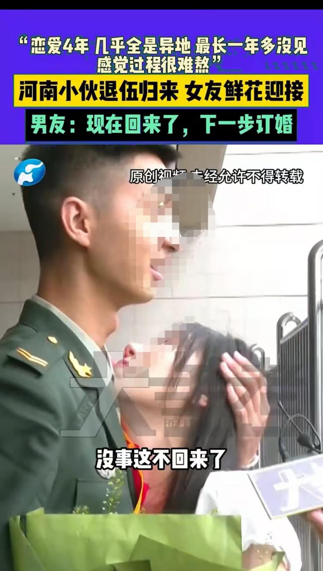 河南郑州,男子退伍回来,女子捧着鲜花去接他。两人感慨,恋爱四年里几乎都是异地恋,最长的时候,有一年多都没有见到过面。旁人都觉得他们相拥的那一刻非常感人,也非常幸福,但只有他们知道这个过程有多么煎熬。男子表示,自己回家的第一件事就是订婚,想给女子最踏实的安全感。 男子在四年前参军入伍,当时已经和女孩恋爱了,女孩为了支持男子的梦想,义无反顾地选择等他归来。 男子去部队后,手机需要上交,不能第一时间接听女子的电话、回女子的信息,只有在规定使用手机的时间,才能和女子聊上几句。 女子从来没有想过会是这样的情形,在男子不能及时回她信息的时候,她总是胡思乱想:先是以为男子不想理自己,后来又怕男子发生什么意外。 就这样,她每天内心都非常煎熬,想让男子告诉自己实情:两人的感情还算不算数?男子到底是不是安全的?他到底能不能正常回自己信息? 男子也很煎熬,部队有规章制度,新兵时期,每个星期有规定的和家属通电话的时间,其余时间手机都不在自己身边,完全像和外界隔绝了一样。 他只能一遍一遍地向女友讲述部队的规章制度,也请求女孩能够谅解自己,但他内心也很纠结:自己在这里一待就是几年,真的要让女友这样无期限地等待自己吗? 两人都陷入了不安和恐惧当中,不知道接下来的路该怎么走,两人的感情该怎么维持。 不过好在他们双方都没有放弃,虽然女孩有委屈,但每次通电话的时候,只要听到男子的声音,她又好像把烦恼全部忘记了。 慢慢的,她知道自己内心依然喜欢着男子,离不开男子,既然明白了自己的心意,她反而不再那么纠结和男子长相厮守,而是用实际行动支持着男子。 既然一个星期才能通一次电话,那就把其余时间用在工作上,用在照顾自己的家人上,也让自己的生活充实起来。 男子也知道了女孩的心意,心中的不安全感放下了很多,也把心思投入到训练当中,在两人通电话的时候,就会滔滔不绝地讲述自己这边的有趣事情。 慢慢的,两人适应了这种节奏,女孩愿意听男子讲他身边的事,男孩也能感受到女孩的体贴与关怀。 就这样,两人曾一年多时间没有见过面,却都坚守住了自己的初心,成功迎来了男子的探亲假。 两人见面后紧紧相拥,觉得这一刻来之不易,但在分开的时候,两人又彷徨了,不知道下一次要到什么时候才能见面。 不过有了第一次的煎熬,他们没有再次陷入思想的混沌,而是按部就班地各自做着自己的事,耐心等待男子的第二次探亲假。 今年5月1号,女子独自踏上了去男子所在城市的路,来到天津看望他,这是她第一次来到男子工作的地方。 男子也向领导请了假,申请去和女子见面,还带着她游玩了一番,两人的心始终在一起,不曾分开过。 女子为了守候这段感情,牺牲了很多;男子为了这段感情,也隐忍了很多,但两人相信,他们的感情一定会守得云开见明月。 终于,女子收到了男子要归家的信息,她一早就去订购了鲜花,在机场等候男子归来。 男子穿着一身军装,挺拔地站在女子面前,行了一个军礼,并大声喊道:“媳妇儿,我回来了,向你报道!” 女子也笑着回应:“收到,欢迎你回家!” 之后,两人相约在一起,十指相扣,这一刻的幸福被网友拍了下来,流传在网上,大家也祝愿他们有情人终成眷属。 女子眼睛沁着泪花,告诉大家:“这一刻,在大家眼里确实是幸福的,但我们的过程真的非常煎熬。” 男子也补充道:“我们恋爱四年,几乎全是异地恋,最长的时候一年都没见上一面。” 不过他深切地看向女子,说:“我们接下来第一步就是订婚。” 女子看到自己坚守的爱情、等待的男子,能把两人的事放在最前面,也觉得这一刻所有的等待都值得了。 那么,在男子服役期间,对男子的恋爱对象有什么优待吗? 根据《军队人员婚姻管理若干规定》,其中主要针对军人结婚、离婚等事项的管理、监督与服务保障工作进行规范,涉及军人结婚对象的要求等内容,但未对恋爱对象的优待作出规定。 《军人抚恤优待条例》,明确抚恤优待对象包括军人、残疾军人、烈士遗属、因公牺牲军人遗属、病故军人遗属、军人家属、退役军人等,而军属指现役军人的配偶、子女、父母和其他有法定抚养、赡养关系的亲属 ,恋爱对象并不在此范围内。 所以,在男子服役期间,其恋爱对象通常没有专门的法定优待。因为目前各类法规中涉及到的优待政策,主要是给予军人本人以及其符合条件的家属,比如配偶、子女、父母等。 恋爱对象由于尚未与军人建立婚姻关系,不属于军属范畴,所以无法享受诸如军人配偶荣誉金、夫妻两地分居费、医疗减免、子女保教费、父母赡养补助金等专门针对军属的优待政策 。 女子和男子坚守了四年的爱情,终于开花要结果了,大家对待这件事是如何看待的呢?素材来源于河南民生频道9月5日报道。