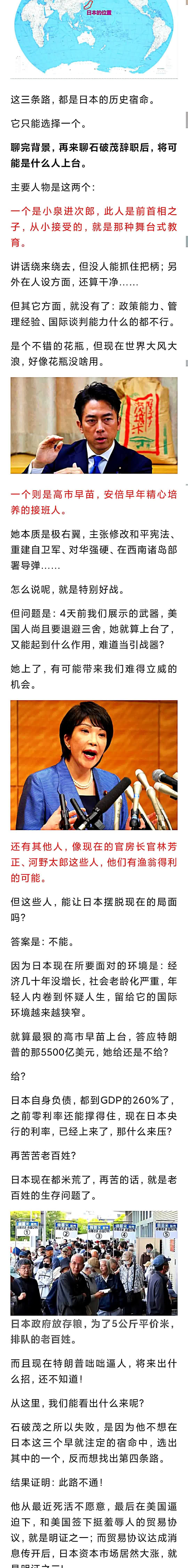 日本终极宿命之门,打开了? 客观,深邃,精辟!日本的宿命就是财阀垄断社会流通途径,底层看不到希望也没有希望和前途,社会逐渐腐烂… 结构出了问题、打补丁无法修复。当贸易跨国依赖性太强、国家的生存绑定到了霉国的战车上。就丧失了金融、经济、和政治的主导性。 日本自己把自己的路走死了。 天作孽尤可活,自作孽不可活。日本现在的惨状不过是自己多年来作死的结果而已。 只看2025年和以后:1.霉国国力日渐衰败,霉国的勒在日本脖子上的绳子也越来越狠,日本挣脱不了; 2.各产业被东大蚕食,日本经济未来几十年已无增长的空间,日本突破不了; 3.东大的国力和武力不断提升,日本任何铤而走险行为赌国运的行为成功率等于零,日本阻挡不了。 好的噶法,被霉国慢慢抽血吸髓至彻底死亡。 坏的噶法,被霉国当耗材推上战中的前线,被东大彻底清算暴毙而亡。 别无第三条路。