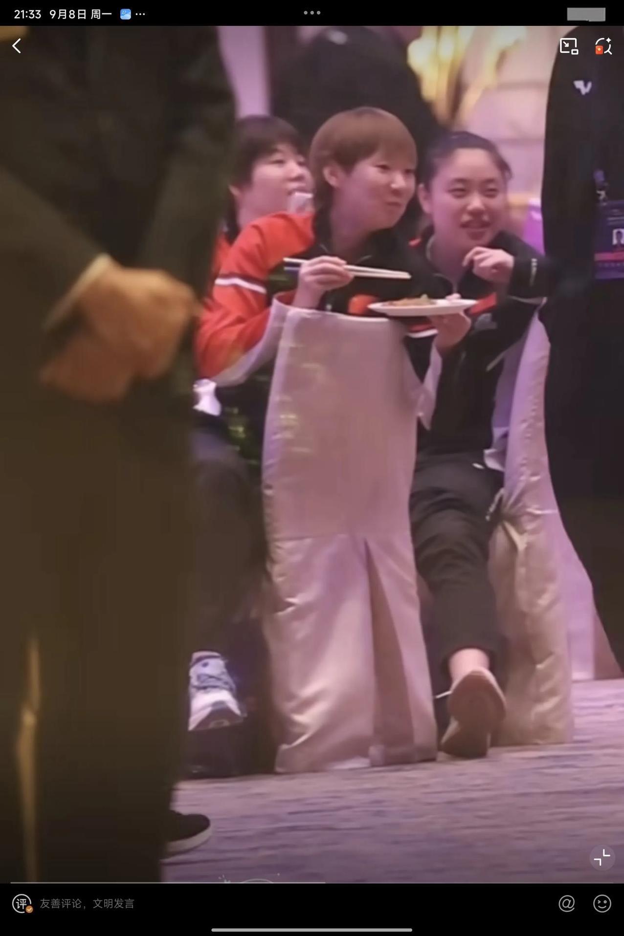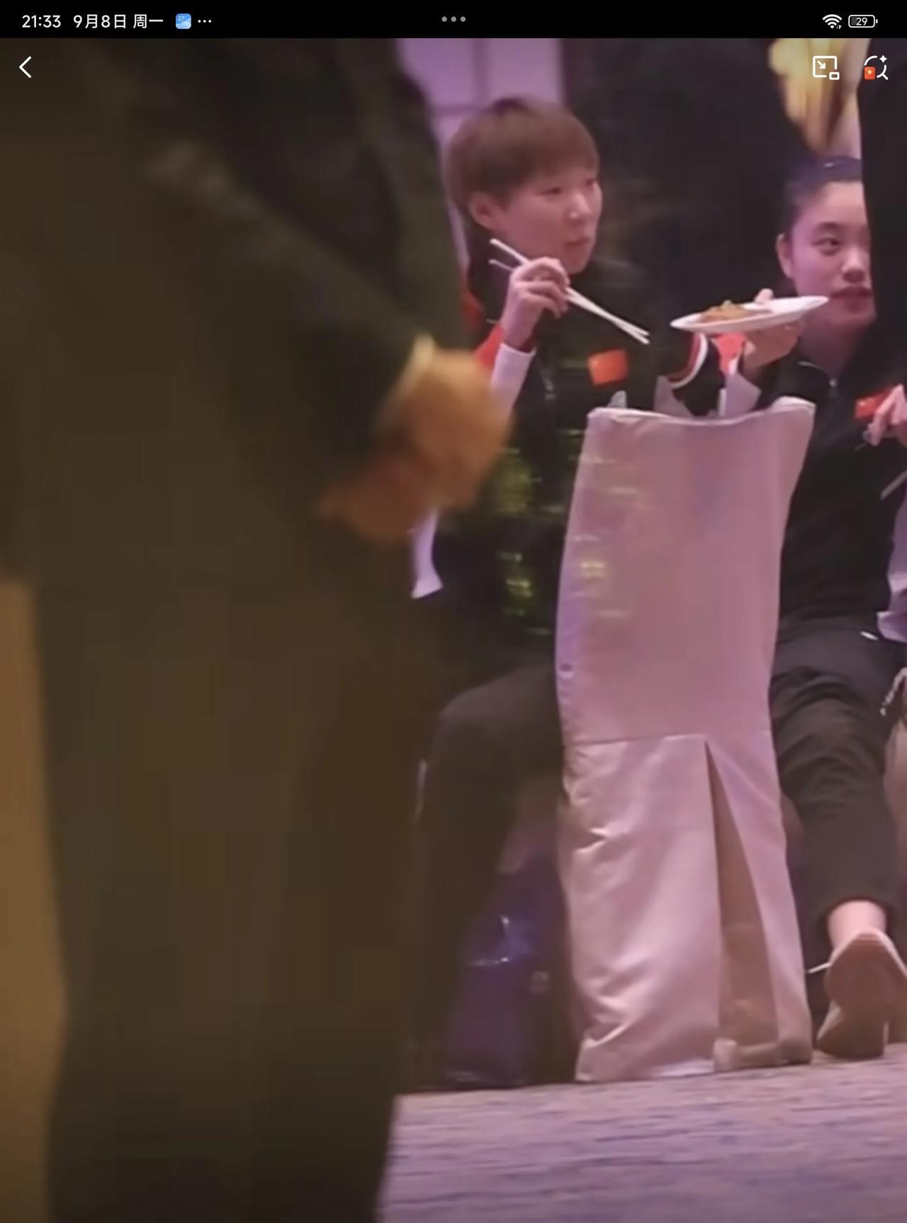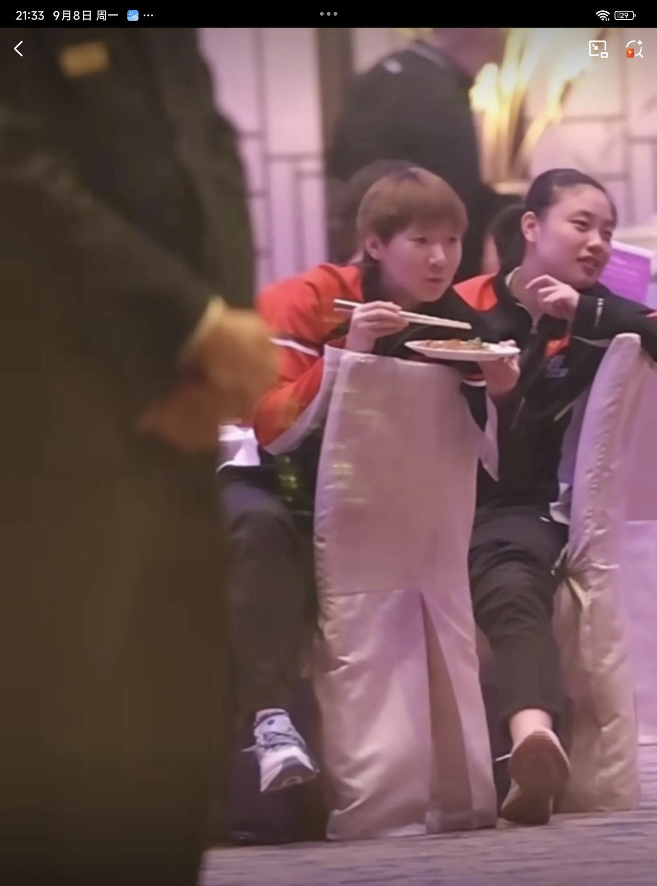 09月08日,王曼昱参加晚宴,翘着二郎腿一边吃一边欣赏节目的样子,实在太可爱了。徐奕刚打完常规挑战赛阿拉木图站,就连忙飞到澳门,跟好姐姐王曼昱跟紧挨坐在一起。 王曼昱端着盘子,这盘子好像是我们广东人的骨碟子,而王曼昱却拿来装食物,看来林高远没有给王曼昱科普广东的吃法哦,看着王曼昱吃得津津有味,吃一大口,在嘴里嚼了大半天,还没吞下去,细嚼慢咽,吃得特别慢,感觉最后吞下去时,还是拿水顺下去的,实在太可爱了,怪不得只长身高,不向横发展,是有原因的,以后大家吃饭也要学王曼昱一样细嚼慢咽才行 王曼昱将在09月10日,晚上20:50分,迎接自己澳门冠军赛的第一位对手郑怡静,两人多次交手,王曼昱均保持全胜的战绩,最近一次是在亚洲杯女单1/4决赛交手过,希望王曼昱一分一分去拼,虽然都赢了,但赢得并不是相当轻松,对手的实力还是蛮强的,要集中精力,不能轻敌,一场 一场打,健康涨球,健康完赛,夺得冠军!
