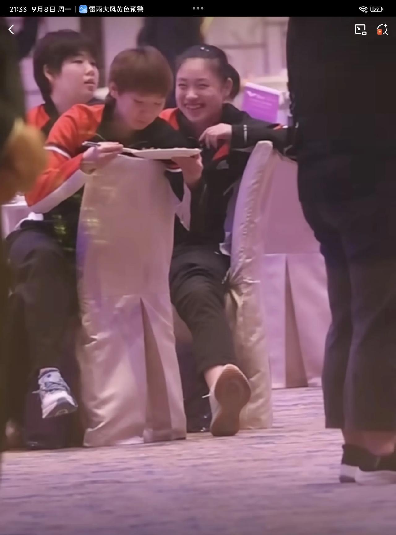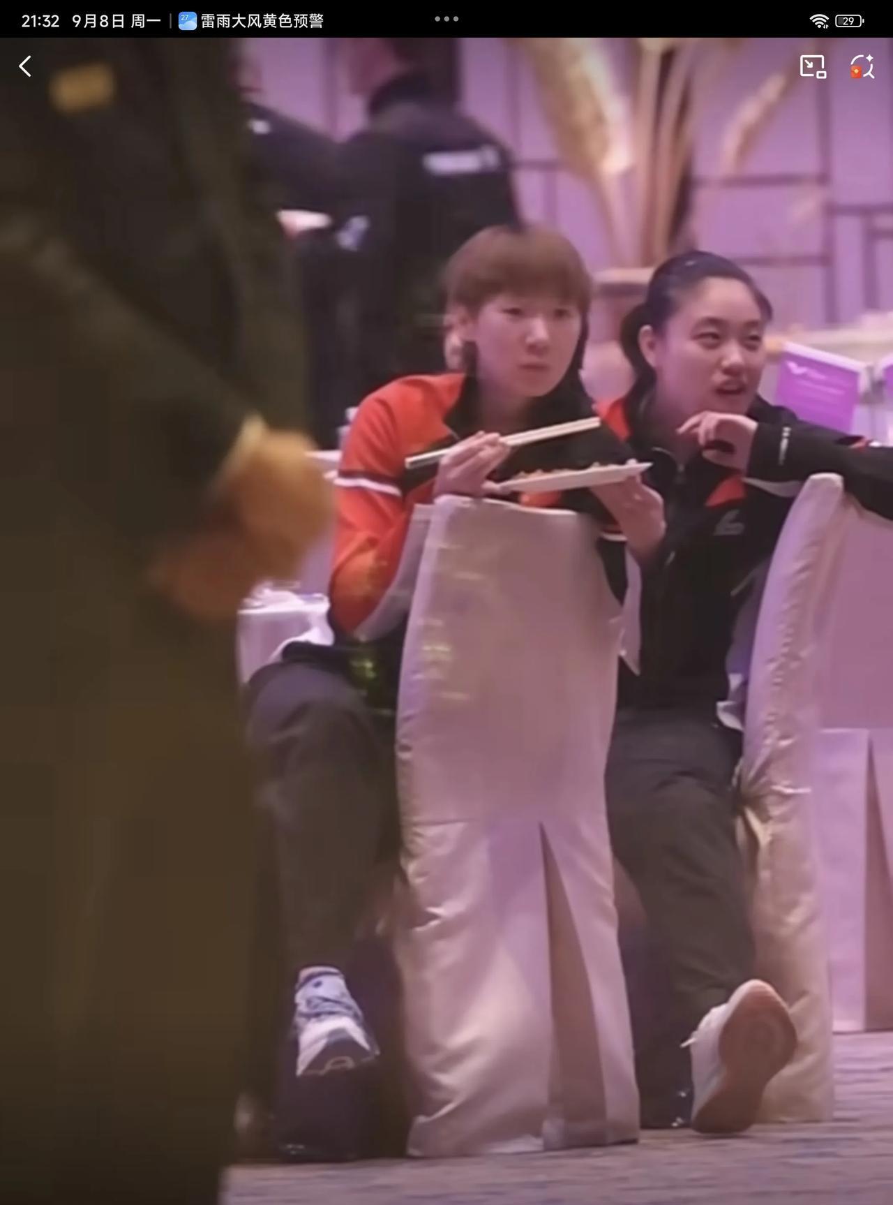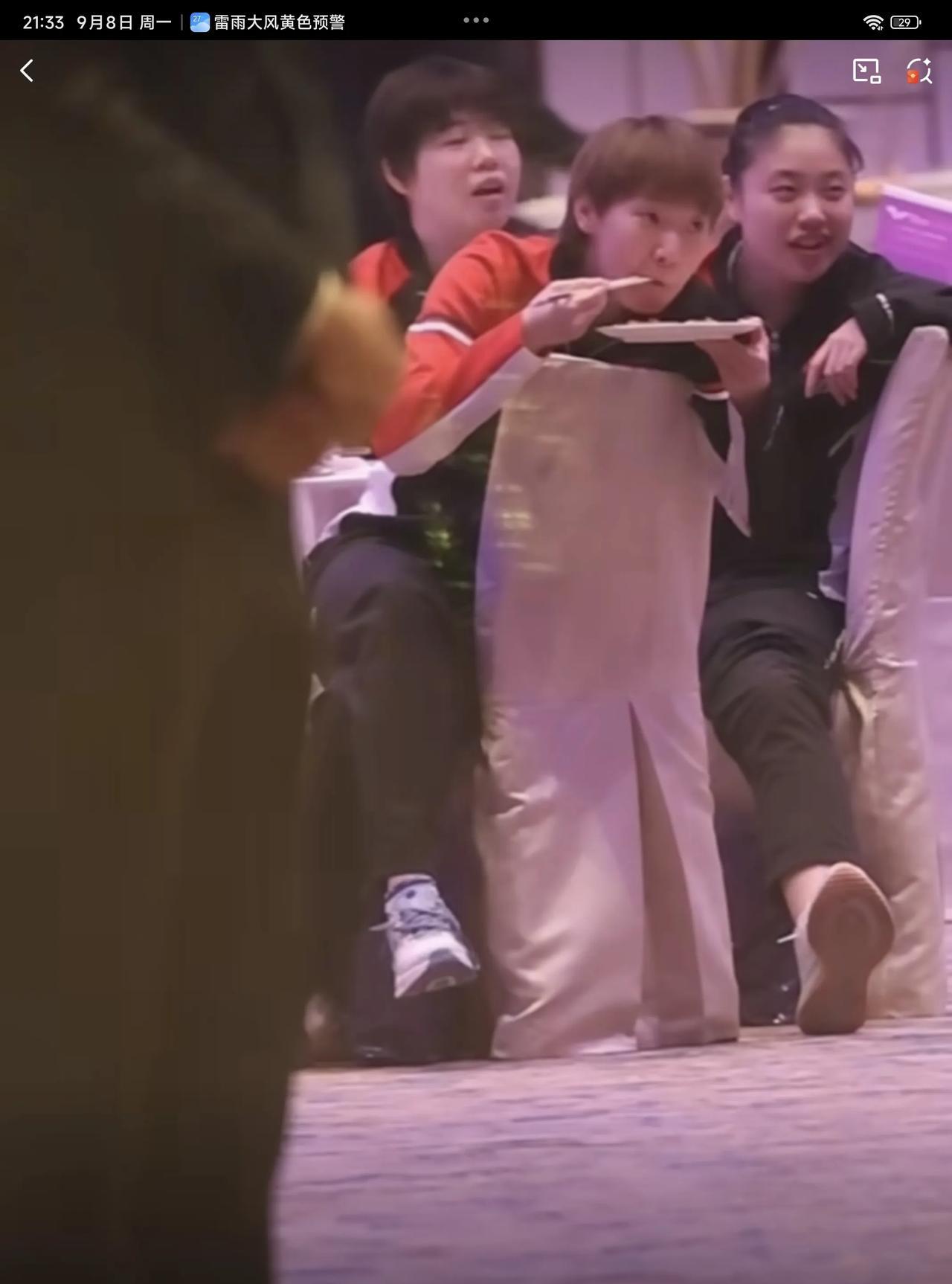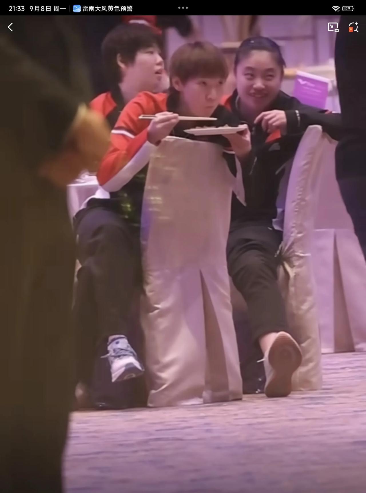 09月08日,王曼昱参加晚宴,翘着二郎腿一边吃一边欣赏节目的样子,实在太可爱了。徐奕刚打完常规挑战赛阿拉木图站,就连忙飞到澳门,跟好姐姐王曼昱跟紧挨坐在一起。 王曼昱端着盘子,这盘子好像是我们广东人的骨碟子,而王曼昱却拿来装食物,看来林高远没有给王曼昱科普广东的吃法哦,看着王曼昱吃得津津有味,吃一大口,在嘴里嚼了大半天,还没吞下去,细嚼慢咽,吃得特别慢,感觉最后吞下去时,还是拿水顺下去的,实在太可爱了,怪不得只长身高,不向横发展,是有原因的,以后大家吃饭也要学王曼昱一样细嚼慢咽才行 王曼昱将在09月10日,晚上20:50分,迎接自己澳门冠军赛的第一位对手郑怡静,两人多次交手,王曼昱均保持全胜的战绩,最近一次是在亚洲杯女单1/4决赛交手过,希望王曼昱一分一分去拼,虽然都赢了,但赢得并不是相当轻松,对手的实力还是蛮强的,要集中精力,不能轻敌,一场 一场打,健康涨球,健康完赛,夺得冠军!