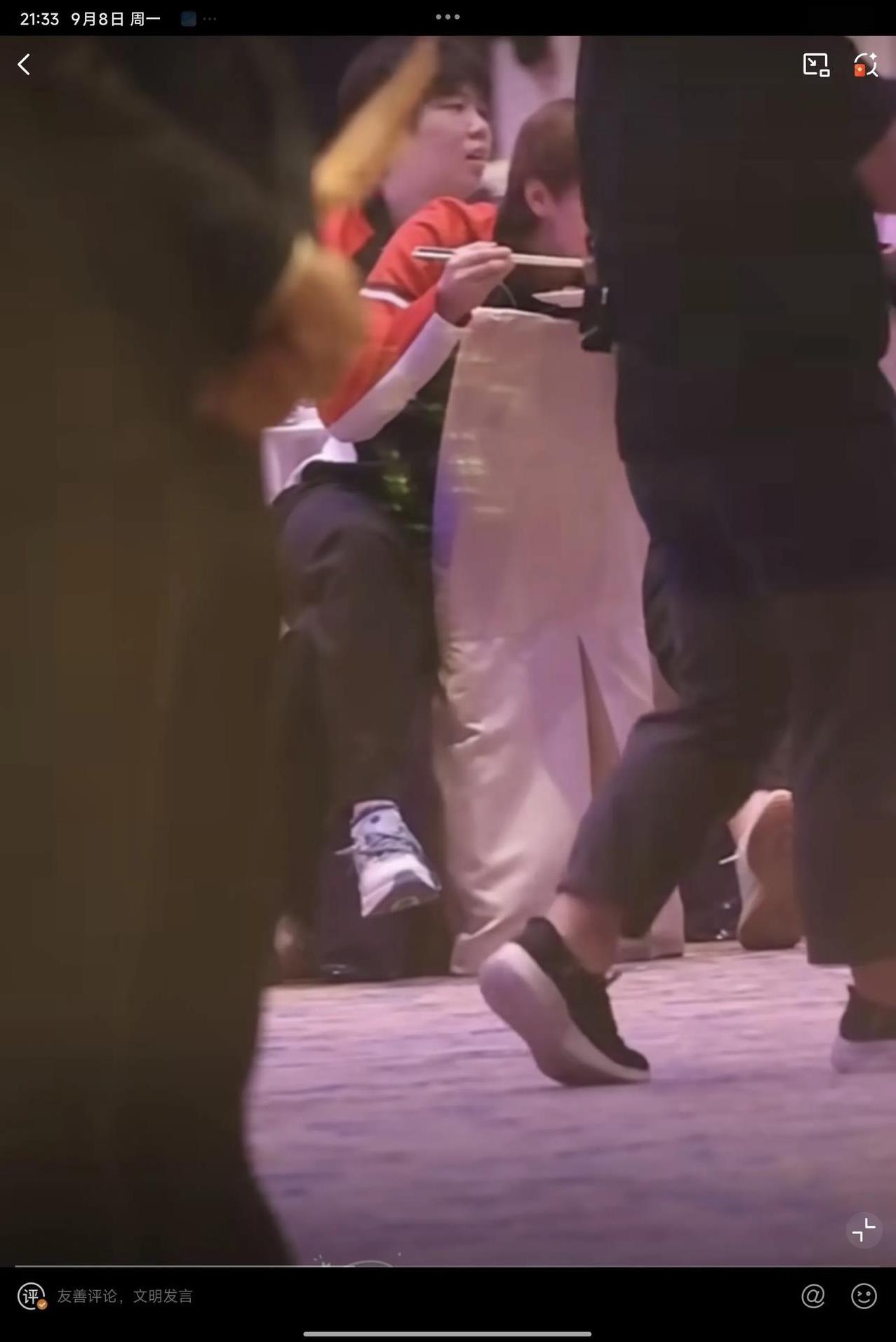 09月08日,王曼昱参加晚宴,翘着二郎腿一边吃一边欣赏节目的样子,实在太可爱了。