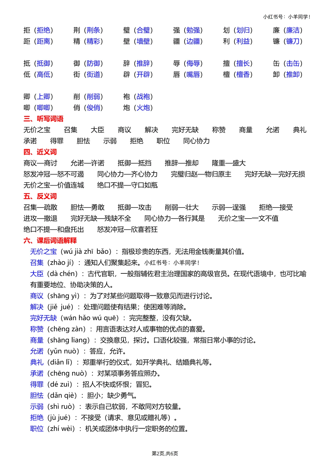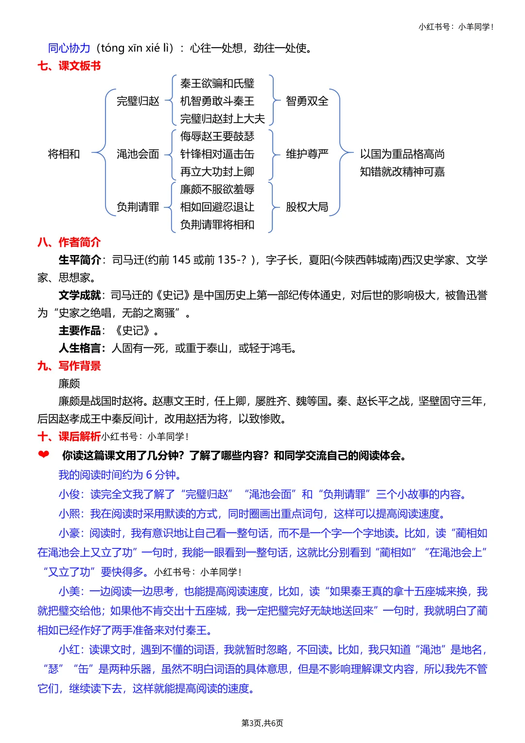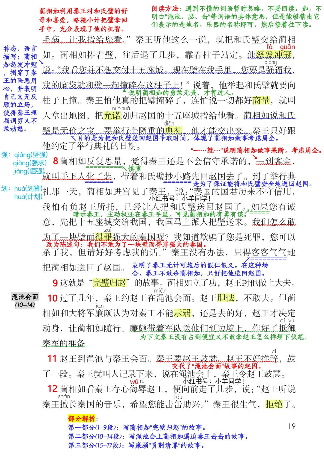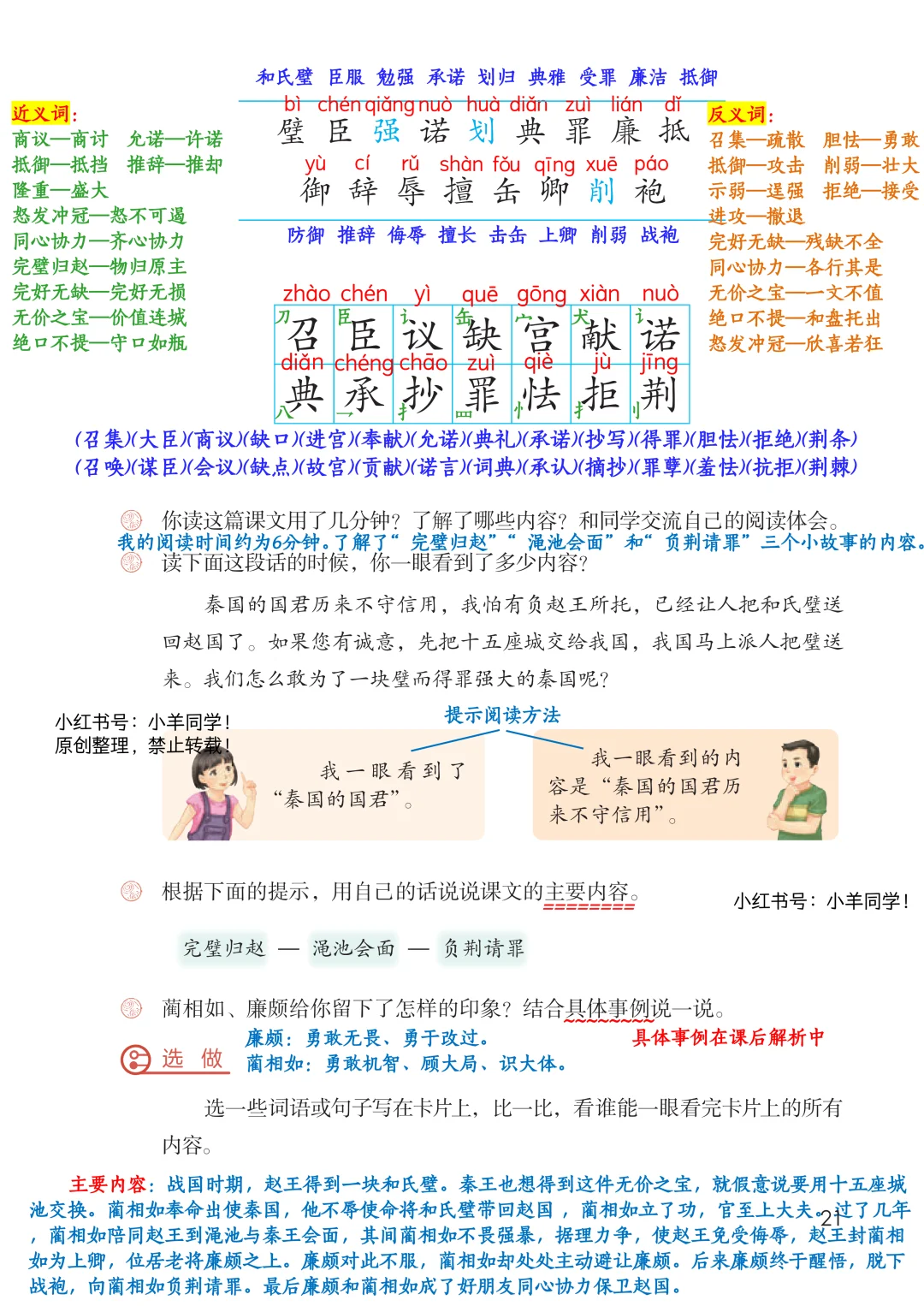 ✅学习目标: 🚩认识“璧、臣”等 137个生字,读准多音字“强、划、削”,会写“召、臣”等14个字,会写“无价之宝、召集”等词语。 🚩能尽量连词成句地读课文,提高阅读速度。(重点) 🚩把握课文的主要内容,体会人物形象(重点);能用自己的话讲述“完璧归赵”“渑池会面”“负荆请罪”三个故事。 🚩结合具体事例说出对廉颇、蔺相如的印象。学习运用人物的动作、语言、神态描写刻画人物性格特点。 ⚠️原创整理,禁止转载发布网络平台或商用。