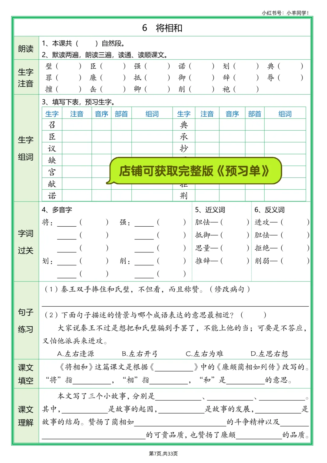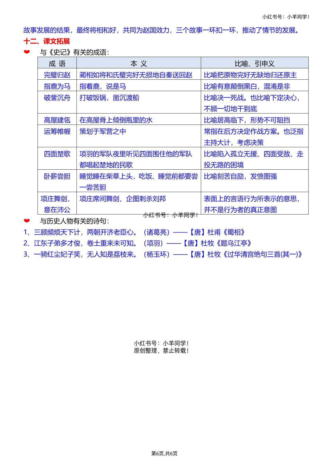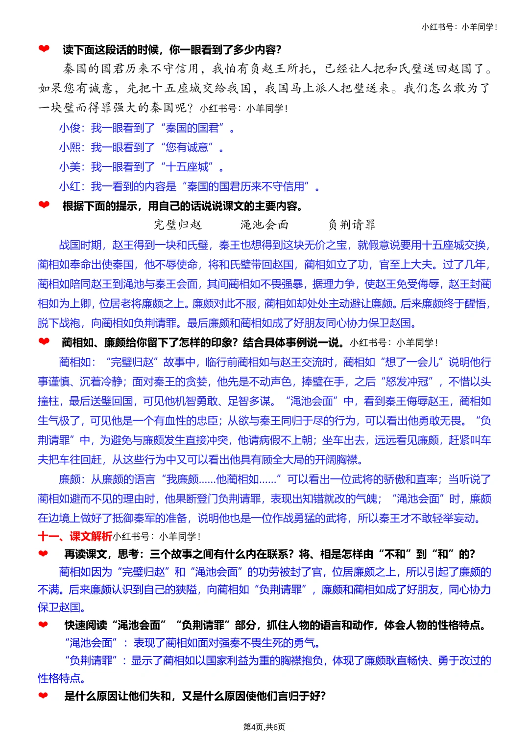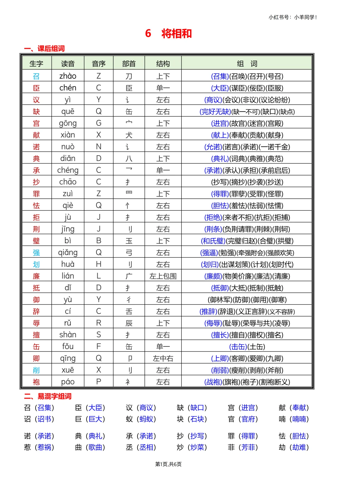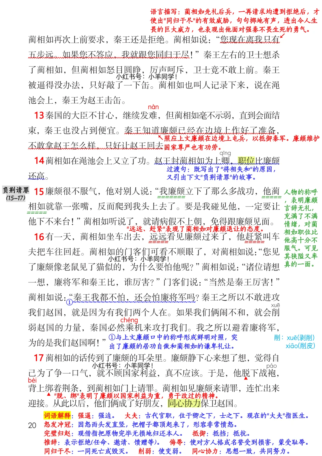 ✅学习目标: 🚩认识“璧、臣”等 137个生字,读准多音字“强、划、削”,会写“召、臣”等14个字,会写“无价之宝、召集”等词语。 🚩能尽量连词成句地读课文,提高阅读速度。(重点) 🚩把握课文的主要内容,体会人物形象(重点);能用自己的话讲述“完璧归赵”“渑池会面”“负荆请罪”三个故事。 🚩结合具体事例说出对廉颇、蔺相如的印象。学习运用人物的动作、语言、神态描写刻画人物性格特点。 ⚠️原创整理,禁止转载发布网络平台或商用。