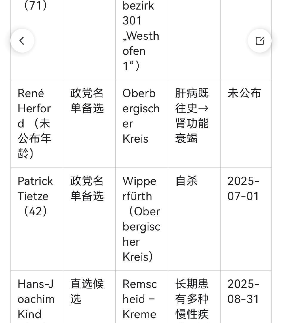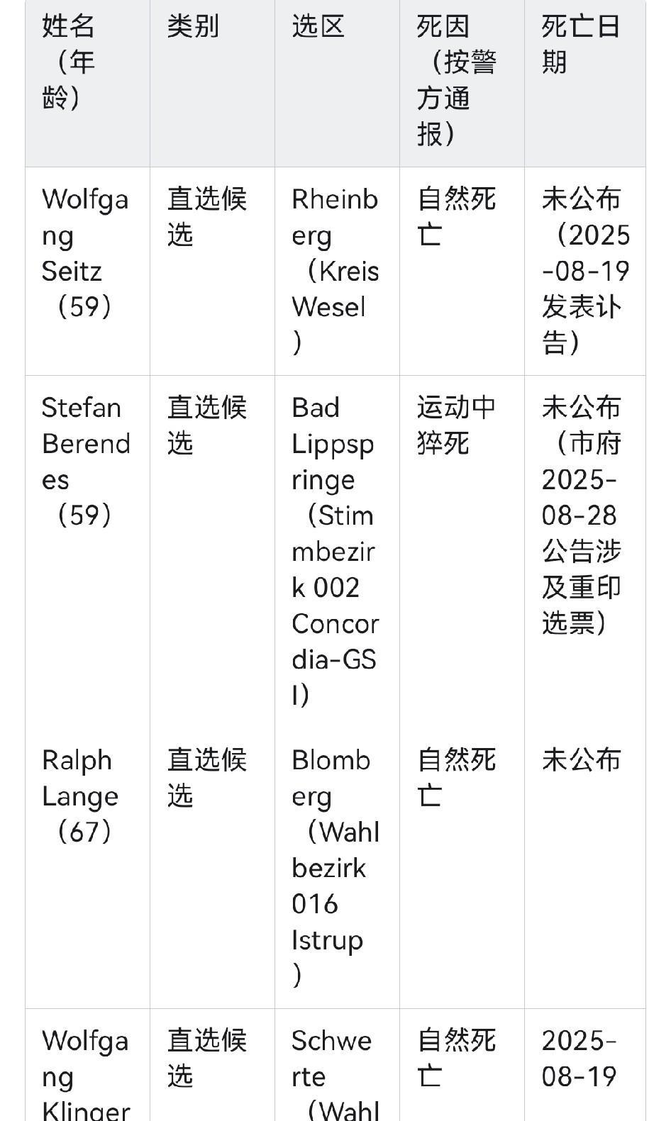 13天7名候选人身亡,果然全世界的白左都是一样的套路,正当竞争搞不过,就杀害对方总统和候选人。 9月14日,德国西部北莱茵-威斯特法伦州将进行选举,德国选择党候选人接连死亡,13天内7名候选人意外身亡,更为搞笑的是,当地警察局却认定,这些候选人的死因没有任何可疑之处,没有发现谋杀迹象,都是死于心脏病或者器官衰竭等自然原因,不会进一步往下调查,这种调查结果不会让人信服。罕见的是,迄今为止德国总理默茨所在的基民盟,以及社民党等主要政党尚无候选人死亡! 德国选择党成员被针对是可以预见的。德国选择党的几个主要诉求是:拆欧盟、反移民和反大国控制,如果真上台了恐怕会加速欧洲的衰亡。 对于德国本身而言,选择党的政治纲领可能符合德国利益。但从欧洲这个整体来说,在经济下滑严重的情况下,本就农业、制造业、服务业萎靡的国家本有补贴、援助没了,这谁接受的了?另外,欧盟这个组织是为了增加欧洲体量、话语权才出现的一种立基于政治、经济的联合体,这个联合体占比重最大的国家就是德国和法国,如果德国选择党的纲领得到实施,那么欧洲在政治、经济上就会如国境线一样被割裂成一小块、一小块的,这对于虎视眈眈的美国来说是乐见其成的。所以,德国选择党可以存在,以保持德国这种独立的呼声,凝聚人心,但选择党绝不可能执政,无论对于欧洲来说还是对于德国来说,选择党的纲领在当下就是加速欧洲死亡呀!