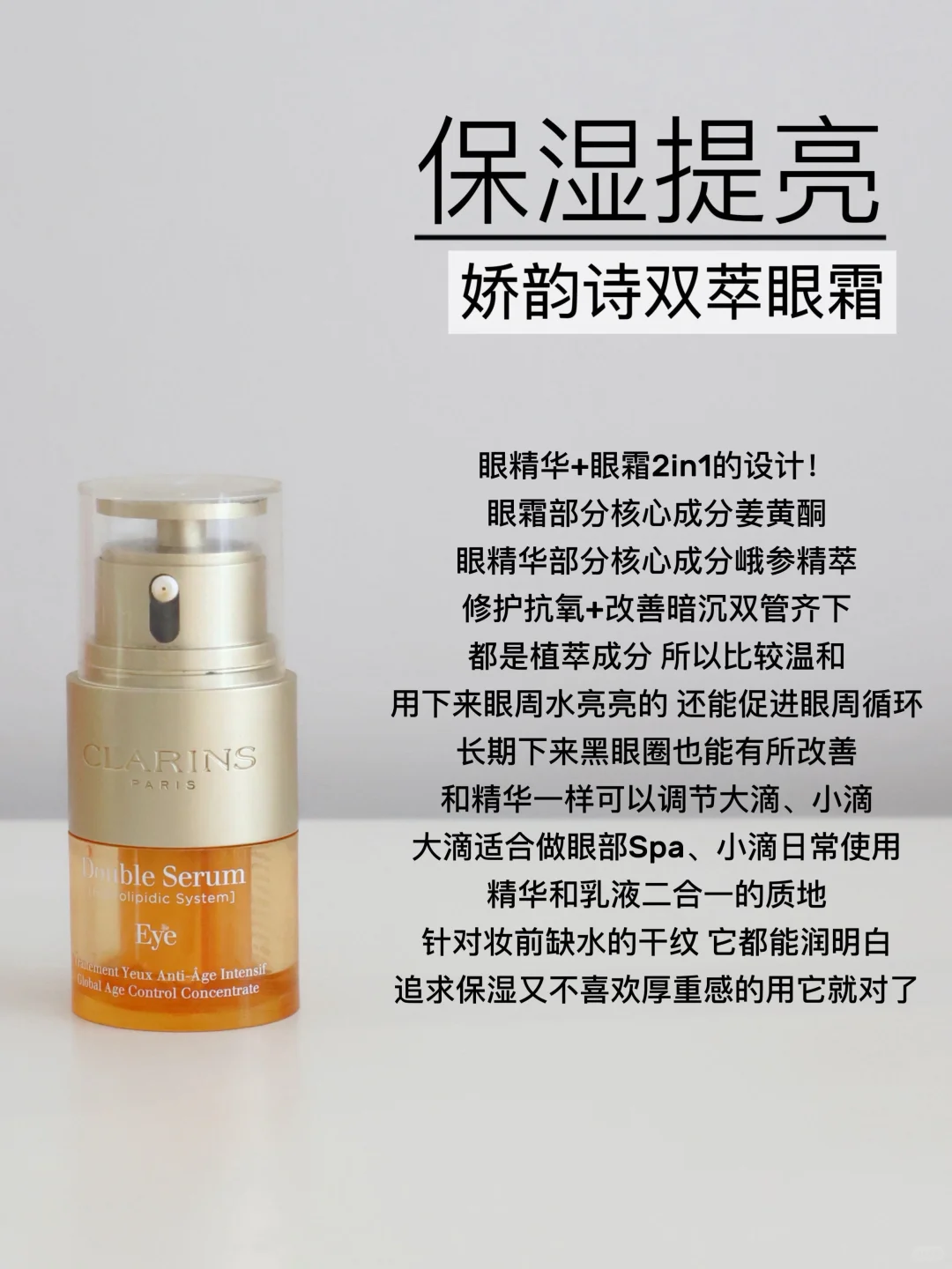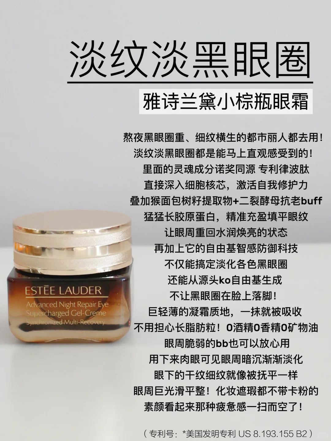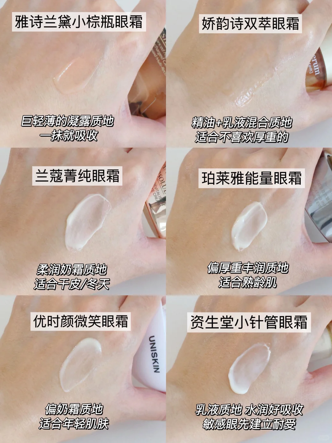 眼睛真的是巨暴露状态的部位! 尤其是长期熬夜下来,眼周松松垮垮,黑眼圈、眼纹都和半永久似的,好显老! 作为一个常年用尽心思对付眼纹和黑眼圈的眼霜大户 基本上市面上的黄金单品我都用过 从我用过的十几瓶眼霜里优中选优! 给大家分享6支惊艳到我!我能用一辈子的眼霜 还不知道怎么选的,可以根据需求对号! 淡纹淡黑眼圈-雅诗兰黛小棕瓶眼霜 保湿提亮-娇韵诗双萃眼霜 充盈淡纹用-兰蔻菁纯眼霜 强韧提拉-珀莱雅能量眼霜 紧致饱满-优时颜微笑眼霜 淡纹淡泪沟-资生堂小针管眼霜