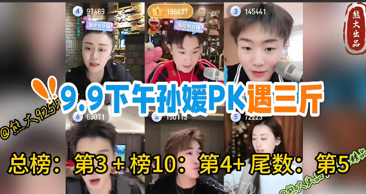 大美媛白天黑夜PK忙,唱歌开会两不误! 9月9日孙媛下午开播,面对公屏个别粉丝的不当言论,毫不客气,霸气回怼,哪里凉快哪里待着去吧! 才艺表演环节,穿插声乐教学,既活跃了直播间气氛,又给唱歌爱好者带来了福利! 有点出人意料的是,男三斤竟然下午开播了,带着一帮兄弟来挑战。0021霸气应战,PK总榜,榜十和三位数!由于秘人哥缺席,最后结果不是特别理想。总榜第3,榜十第4,三尾数第5。虽败犹荣! 孙媛回到直播间刚唱一首歌,没想到三斤又杀了一个回马枪!7宫格要打榜100,由于3点时段大美媛人气榜没有进去前10,所以榜100,决定打1314人气票! 最后结果,大美媛打出14.9万票,获得第四!对于白天来说,大哥大姐不齐,这个成绩已经相当厉害了!但是不得不说,男三斤确实厉害,音浪还是百万➕。 今天下午孙媛的直播真是才艺PK两不误,音浪粉丝都丰收!