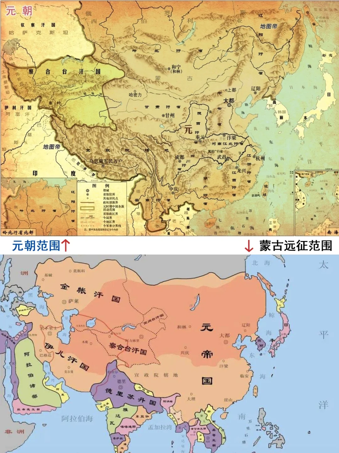 1271年忽必烈建元,国祚98年传11帝。虽疆域达3500万平方公里,但没全部实际控制。