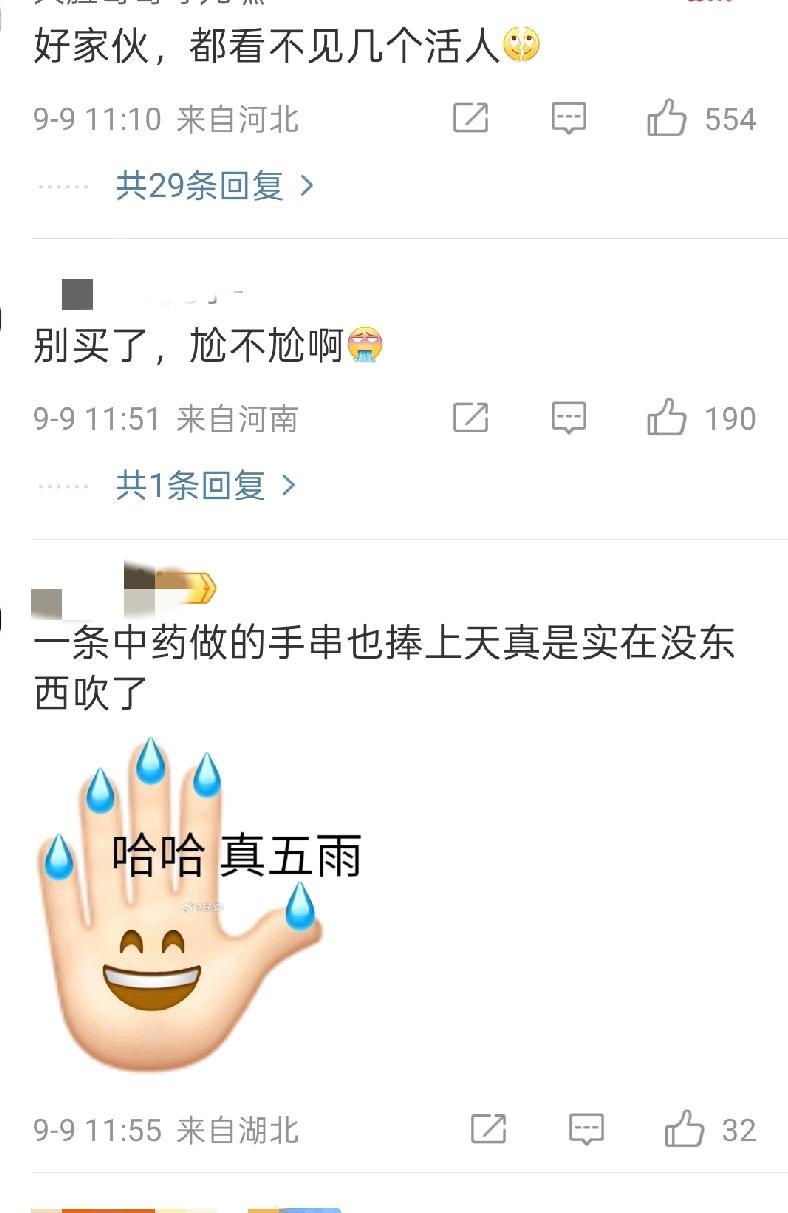 曾黎的口碑救不回了! 9月9日,曾黎工作室晒出曾黎手上佩戴的手串,说是中药制作的,疏肝解郁的,评论区很快了涌入上百条夸赞,但是细看就发现这些夸赞一股人机味,都是买的水军。 一些真人网友直接不客气的在评论区吐槽: 一条中药做的手串也捧上天真是实在没东西吹了 。 别买了,尬不尬啊? 好家伙,都看不见几个活人。 而这些真人网友吐槽后,居然没有曾黎的粉丝出来维护,可见曾黎之前和粉丝礼物事件,不仅把自己的路人缘砸了,还把粉丝的心伤透了。 这中药自制手串,搁以前都能被粉丝夸上天,网友们也会觉得她热衷养生,保养的很好,各种夸夸。 但现在她就算特意买了水军给自己刷好评,都没用,这崩坏的口碑终究还是挽不回。