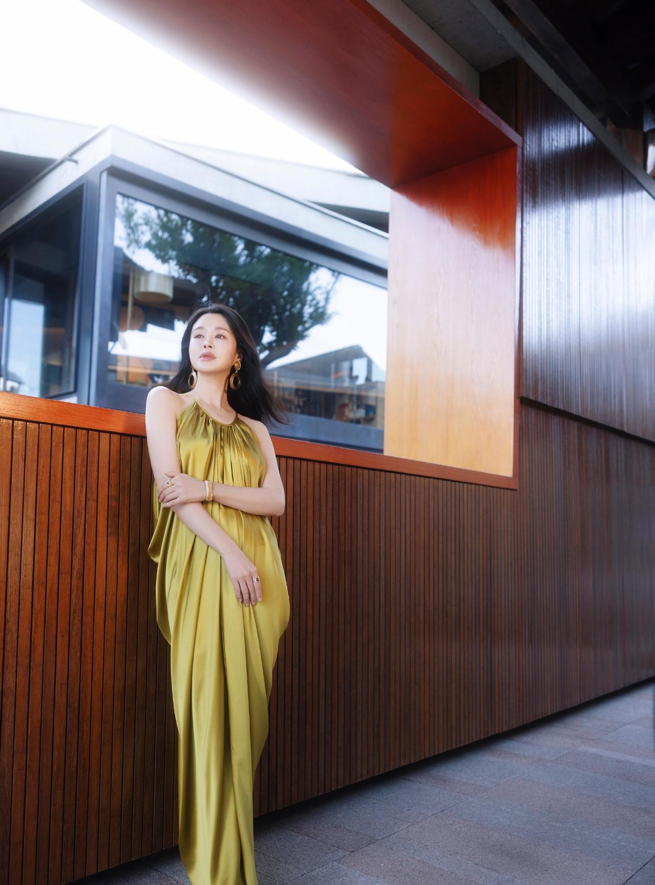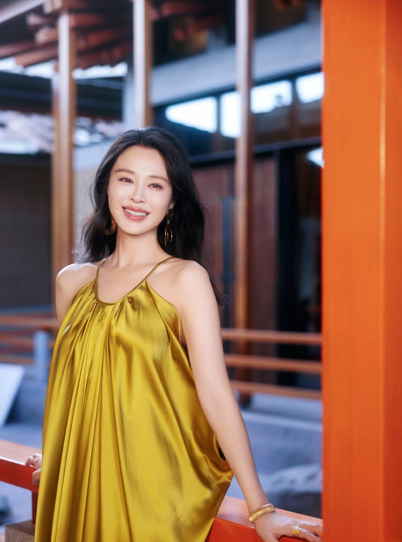 关悦亮相栩栩华生时尚文化大赏! 一身鎏金吊带裙把优雅与高级感焊在身上,和男士同框