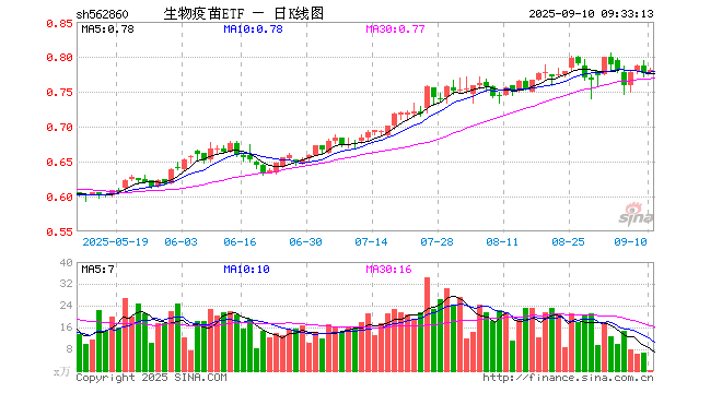 9月10日,生物疫苗ETF(562860)开盘涨0.26%,报0.778元。生物疫苗ETF(562860)重仓股方面,智飞生物开盘跌0.18%,万泰生物涨1.87%,沃森生物涨0.08%,康泰生物涨0.00%,辽宁成大涨0.08%,山东药玻跌0.09%,君实生物涨0.50%,甘李药业涨0.54%,复星医药涨1.04%,华兰生物跌0.53%。