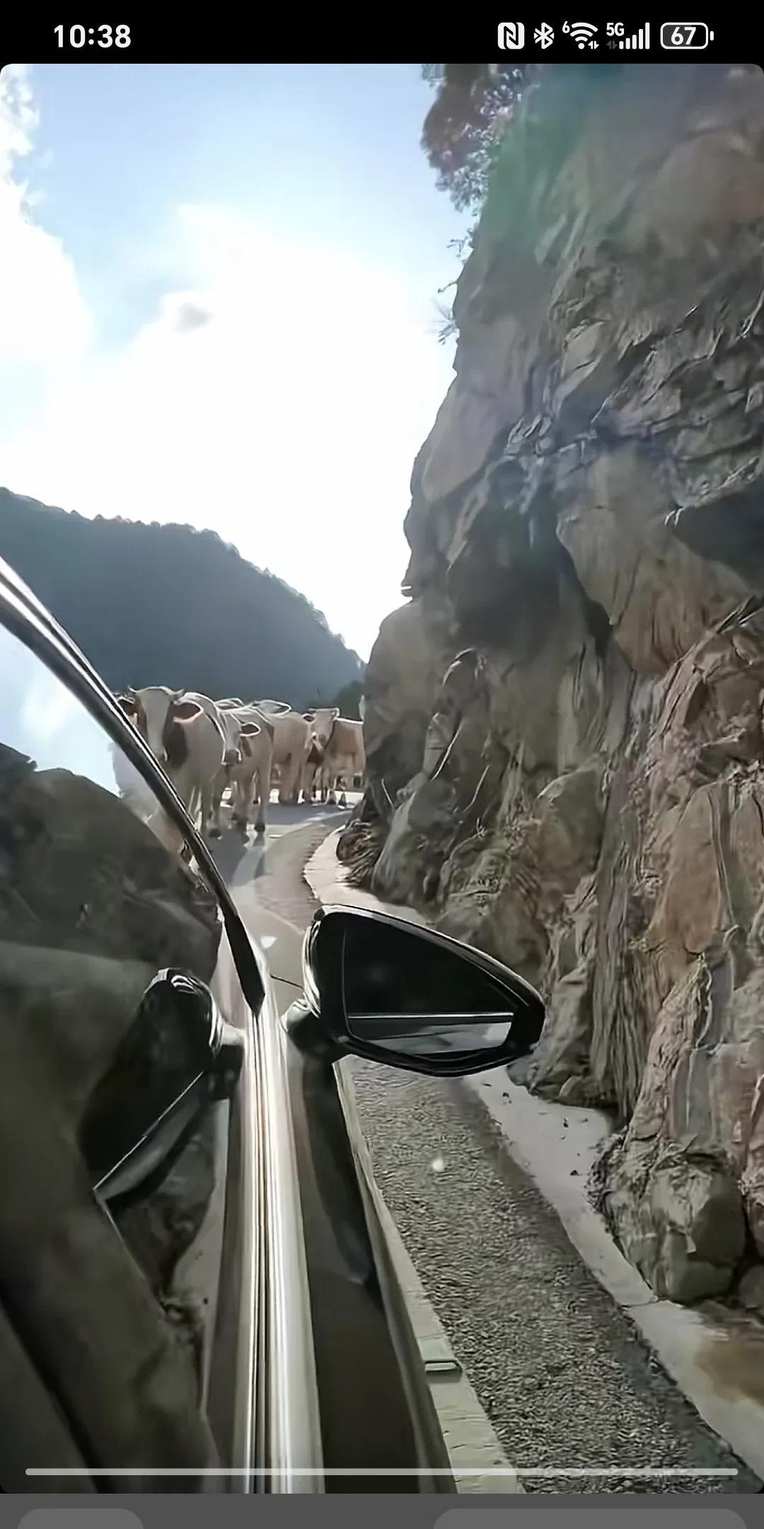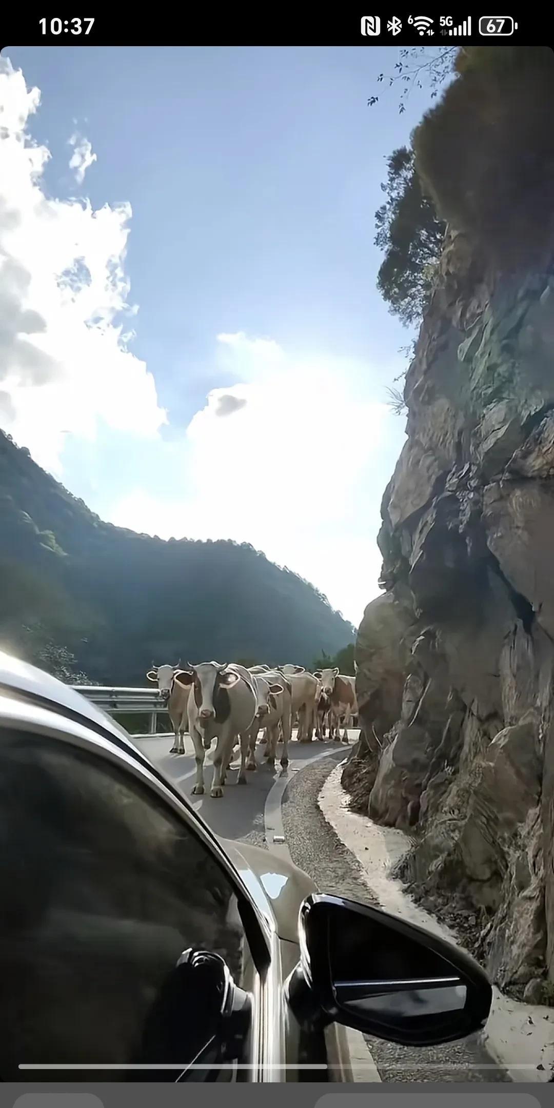 今天我是理解什么叫犟牛了,转角遇到牛群,还没主人。你们看领头牛那眼神杀,我们都不敢下车都,这是对峙上了, 后面堵了一排车,我们也不好动呀,倒是孩子们在车里很兴奋,太酷了。 科一,科四就是这样说的,不要驱赶,不要鸣喇叭,等待。 打开车窗告诉它们是本地的,它们心想本地人不骗本地人,转头就走了。