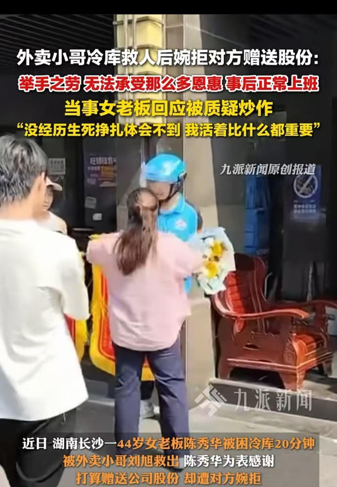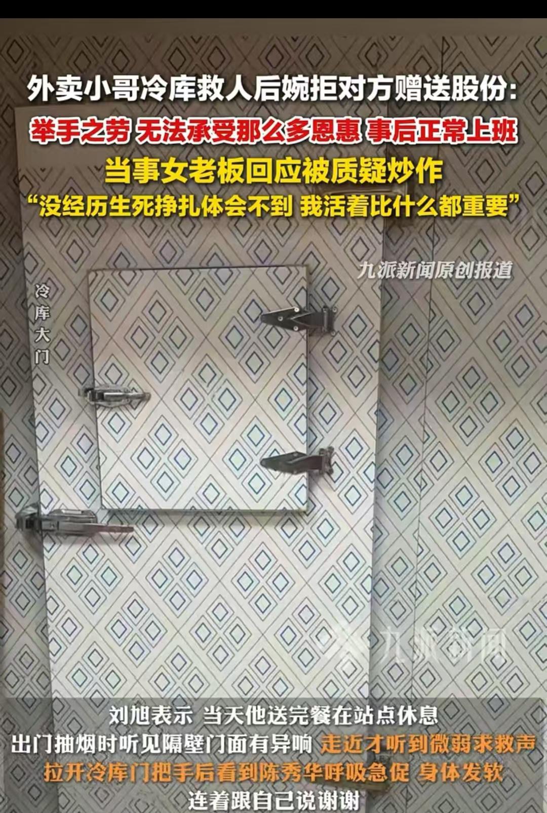 湖南长沙,外卖员救了冷库的老板娘,老板娘为了感谢他送股份,但外卖小哥不愿意接受,觉得是举手之劳的事情,并愿意和老板娘以姐弟相称,老板娘承诺以后就把外卖员当成自己的亲弟弟看待。另外,外卖员也受到了饿了么的嘉奖,获得了一万元,以及“城市骑手·社区侠”的称号。 据九派新闻9月8日报道,陈秀华在去年注册了一家公司,注册资金是200万,专门给别人配送冷冻产品。 他们门店旁边就是外卖小哥刘旭的站点,平时来来往往的时候会互相招呼一下,毕竟是邻里邻居,总觉得多了一份亲热感。 事发当天,刘旭送完了手中的餐,回到站点准备继续接单,回去的时候他不自觉地朝着陈秀华的门店望了一眼,发现里面没人。 其实这也是一种习惯性的行为,就是顺带看了一眼,不过他骑了两步,就发现陈秀华的门市里面有异样,传来了“咚咚咚”比较微弱的声音。 他本来都骑到站点了,可心里总有点忐忑不放心,于是又从自己站点绕到陈秀华门市的后面,想去瞧瞧这声音到底是什么。 这时他才发现,刚刚的声音是从陈秀华的冷库里传来的,而且里面还有微弱的呼救声。 刘旭赶紧把冷库的门打开,这才发现陈秀华已经奄奄一息地待在那里。 刘旭赶紧把陈秀华移到外面,又叫了大家来帮忙。陈秀华接触到外面的阳光和空气,整个人缓和了很多,休息了一下就没什么大碍了。 陈秀华把刘旭看成了救命恩人。当时她去冷库帮客户备东西,本来冷库门是开着的,但因为外面温度有点高,担心里面的东西融化,就把门给关上了,想着反正等下自己能从里面打开。 可当她把顾客的冷冻产品都备好后,想开门时却发现打不开了。一开始她还没太在意,可尝试几次都没用后,才慌了神。 随后她一摸口袋,发现手机没带进来,这一下更慌了。她拼命踹门,希望有人能听到,可冷库的大门在后方,很少有人会绕到这后面来。她越想越急,越想越怕,甚至都想给女儿写遗书了。 身边连个计时的东西也没有,当时她思绪特别混乱,什么坏的情况都想到了。 不过陈秀华还是没有放弃努力,她用里面的东西敲打冷库门,觉得就算努力后不成功,也比直接放弃好。最后她还抱起装有20斤饺子的袋子朝着冷库门砸去,就想让动静大一点,吸引旁边或过往的人注意到里面有人。 冷库里本来空气就稀薄,她为了吸引路人,不惜耗费了大量精力,在里面努力了20多分钟,终于等到门被打开。 陈秀华从绝望到希望,从零下30度的冷库来到室外30度的高温环境中,还有阳光和空气,她简直像做梦一样,差一点就和家人阴阳两隔了。因此,把刘旭看成救命恩人,一点都不为过。 后来陈秀华的家人们也特别感恩刘旭,陈秀华可是他们家的顶梁柱,刘旭把她从死亡线上救了回来,他们觉得应该拿出实际的东西感谢刘旭。 最后,他们决定把自己公司的一部分股份分给刘旭,即便这样,他们还觉得不够。不过刘旭知道后断然拒绝了,他觉得不应该接受陈秀华的这份恩惠,自己救人的初衷就是单纯救人,不是为了得到回馈。 他还表示,和陈秀华特别有缘分,以后就以姐弟相称,做一辈子的姐弟。 陈秀华看到“弟弟”这么优秀、人品这么好,虽然她一心想把股份分给刘旭,但对方不接受,也不能强人所难,就答应和刘旭做一辈子的姐弟。 不过刘旭的好人好事被饿了么平台知道后,平台马上对刘旭进行了嘉奖,不仅奖励了他1万元,还将他评为“城市骑手·社区侠”。 网友们看到这个故事后,都觉得特别温馨,也从陈秀华和家人的聊天记录中看得出,这件事是真实的,并不是有些人认为的那样是为了博取流量。 其实,刘旭救了陈秀华,陈秀华想把公司的股份赠与部分给刘旭,刘旭是可以接受的,一点问题都没有。 依据《公司法》规定,有限责任公司的股东向股东以外的人转让股权(包括赠与这种无偿转让方式),应当经其他股东过半数同意。当陈秀华想赠送股份给刘旭时,只要满足这一条件,即获得其他股东过半数同意,股份赠与便可进行。 陈秀华注册公司的时候是以她的女儿名义注册的,但她的女儿也非常感激刘旭,也非常支持母亲的做法,同意母亲将公司一部分股份转给刘旭。这种情况下,这份赠与合同是合法有效的。 当然,刘旭不愿意接受,只想和陈秀华以姐弟相称,做一辈子的姐弟,这也符合刘旭的意愿,大家也非常赞同他的做法。 那么,如果是你,会不会接受刘秀华的股份呢?文中人物均为化名,素材来源于九派新闻9月8日报道。