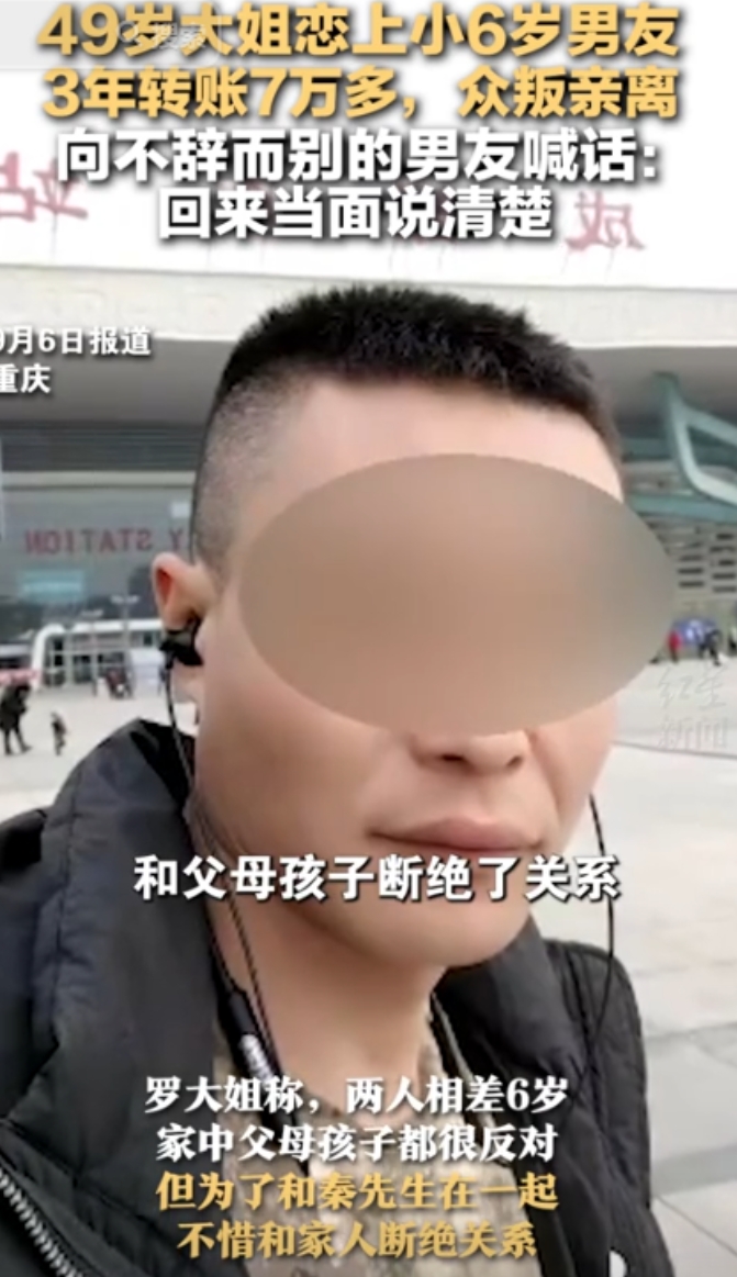 “被白嫖了!”2022年,重庆,一49岁大姐和小6岁的男友交往,仅仅3年内,就给对方转去了70000元!为了和男友在一起,大姐不惜抛弃父母和孩子,甚至还断绝了关系!原以为能和对方共度余生,没成想只是拒绝了男友要400块的请求,男友居然人间蒸发,再也找不到!这时大姐才明白被骗,于是就在记者前哭诉,整个重庆都找不到她这样好的女人! 49岁的罗大姐和小她6岁的男友恋爱三年,本以为找到了人生伴侣,结果却因为400元车费,彻底看清了对方的真面目,也让她掉进了“爱情陷阱”,人财两空。 罗大姐早年丧偶,一个人把两个孩子拉扯大,生活辛苦、孤单,内心一直渴望被爱。 2022年8月,她通过朋友认识了秦先生:一位离异带着两个女儿的男人。 第一次见面,秦先生开朗、风趣,还有一张帅气的脸,让罗大姐一下子心动。 接下来的日子,秦先生热情追求:每天早安问候,深夜微信关心,偶尔忘带伞,他都会立刻出现。 这些贴心举动,让罗大姐彻底陷进爱情里,认定他就是自己命中注定的那个人。 可罗大姐的家人完全不赞成这段恋情。 他们担心两人年龄差大,秦先生还带着孩子,怕他另有所图。 但陷入爱情的罗大姐根本不听,她甚至为了和秦先生在一起,断了和家人的联系,毅然搬去和他同居,把他的两个孩子当作自己孩子一样照顾,满心想着组建幸福家庭。 然而,同居没多久,问题就来了。 秦先生开始频繁向罗大姐要钱:一会儿生活费不够,一会儿女儿学费、上班路费……每次数额不大,但积少成多,三年下来,罗大姐总共转给秦先生7万多元,几乎花光了所有积蓄。 她从没怀疑过,觉得两个人既然要共度余生,互相帮忙理所当然。 今年7月,秦先生回重庆探望罗大姐,准备回工地上班时,向她要400元车费。 恰巧罗大姐刚交完水电费,手头真没钱。 没想到,秦先生当场就翻脸了,两人大吵一架,他摔门而去,从此人间蒸发:电话不接,微信不回。 罗大姐焦急地四处寻找他,联系秦先生的家人和前妻,却没人知道他的下落。 这时,她才猛然醒悟——自己可能掉进了一场精心设计的爱情骗局。 无奈之下,她求助媒体,希望曝光事件,让秦先生出来给她一个解释。 这件事一曝光,网友们炸开了锅。 大家指责秦先生从一开始就把罗大姐当成“提款机”,有人批评她太“恋爱脑”,盲目付出,甚至为爱和家人撕破脸,最后落得如此悲惨。 心理学专家也指出,罗大姐这种全身心投入、忽略风险的“恋爱脑”行为并不少见。 通常这些人在成长过程中缺乏情感关爱,一旦恋爱中感受到温暖,就容易投入过度,甚至失去自我,把爱情理想化,忽略对方的真实意图,最后受伤。 恋爱中一定要保持理智,别被甜言蜜语冲昏头脑。 如果对方总是涉及金钱问题,要警惕、学会保护自己的财产和情感安全。 对此你怎么看? 信源:红星新闻