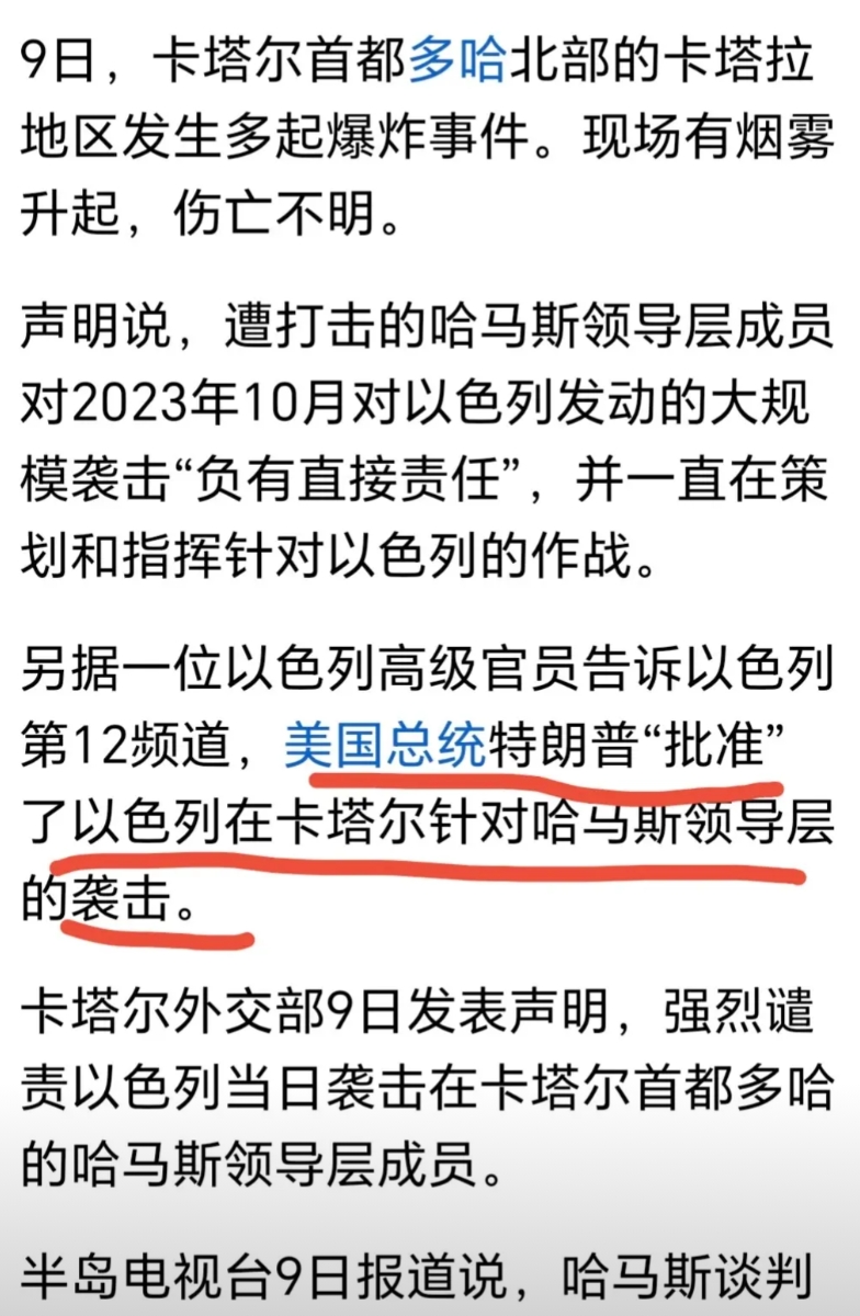 大家看下面新闻,另据一位以色列高级官员告诉以色列第12频道,美国总统特朗普“批准”了以色列在卡塔尔针对哈马斯领导层的袭击。哈马斯谈判代表们正在研究特朗普给的构想,这就是标准的诱杀!