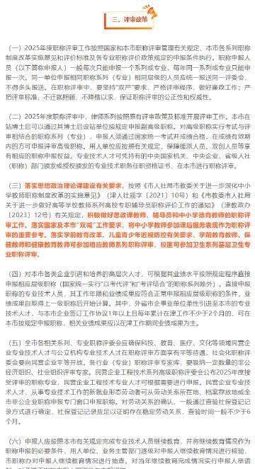 【天津发布开展2025年度职称评审工作的通知】9月10日,天津市人社局网站发布市人社局关于开展2025年度职称评审工作的通知,各行业(专业)主管部门根据本通知,制定本职称系列(专业)2025年度职称评审方案,内容包括系列(专业)层级、评审标准、评审方式、岗位要求、申报材料、时间安排等,报市职称办备案后,于9月22日(星期一)18时前向社会公布。申报人自10月9日(星期四)9时起登录职称评审系统,按要求在线填报相关信息、上传佐证材料,并提交至用人单位。