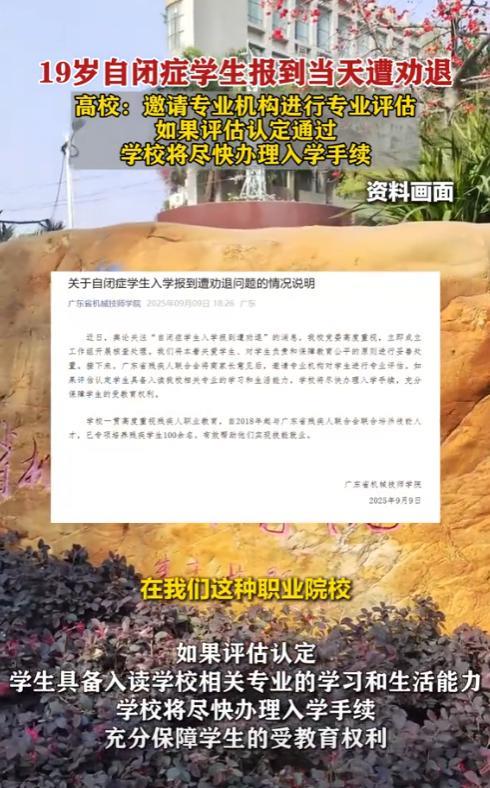 广东,一19岁男生去大学报到,但因为写字有点慢,父亲就礼貌地跟老师说明他有轻度自闭症,让多担待。结果老师当场就说不收自闭症学生,还劝他们:“就算来了也学不下去,到时候情况更糟。” 据南国早报9月10日报道,广东一个19岁的男生,寒窗苦读那么多年,总算考上了自己心仪的技师学院,一家人高高兴兴地陪他去报到,本以为是新生活的开始,谁能想到,这竟成了一场噩梦的开端。 这个男生,虽然被诊断为轻度自闭症,但他的情况并不严重,日常生活完全没问题,更重要的是,他学习特别努力,从小到大成绩都不差。 你想想,一个有特殊情况的孩子,要付出比别人多多少的汗水,才能在特教班里脱颖而出,成为唯一一个考上这所广东省机械技师学院的学生?这背后的艰辛,只有他和他的家人才知道。 可以说,这张录取通知书,是他用无数个日夜的奋斗换来的,分量比谁的都重,结果就因为填表时写字慢了一些,引起了老师的注意。 他父亲也是个实在人,想着以后孩子要在这儿学习生活,跟老师提前打个招呼,别产生什么误会,也是为了孩子好,他可能怎么也想不到,自己这句充满恳求和希望的话,竟然成了孩子被拒绝的导火索。 那位老师听完,跟旁边的领导嘀咕了几句,然后就直接给他们判了“死刑”:“就算来了也学不下去,到时候情况更糟。” 这话听着多刺耳!什么叫“就算来了也学不下去”?人家还没开始学呢,你怎么就知道他学不下去?这是学校老师该说的话吗?这不就是赤裸裸的歧视吗? 学校的职责是教书育人,是给每一个有求知欲的学生提供机会,而不是凭自己的主观臆断,提前把人筛选掉。 有网友说得好:“学校应该是最后的避难所,而不是第一个将他们推开的地方。” 这话真是一针见血,这件事最让人心寒的地方,就是学校这种“一刀切”的冷漠态度,他们没有去了解这个孩子到底是什么情况,没有评估他的学习能力,甚至没有给他一个展示自己的机会,仅仅因为“自闭症”这三个字,就粗暴地关上了大门。 这种做法,不仅伤害了这个努力上进的孩子和他的家庭,也暴露了我们社会在对待特殊群体时,还存在着多大的偏见和无知。 很多人可能对自闭症不太了解,一听这名字就觉得是精神有问题,其实根本不是那么回事,自闭症是一种发育障碍,很多轻度的孩子,智力是完全正常的,甚至在某些方面还有超乎常人的天赋。 他们只是在社交和沟通上跟我们不太一样,就像有的电脑用的是Windows系统,有的用的是苹果系统,系统不一样,不代表电脑就坏了。 他们被称为“星星的孩子”,就是因为他们活在自己的世界里,像天上的星星一样,独自闪烁。 这个19岁的男生,他通过自己的努力,证明了自己有能力接受普通高等教育,他需要的不是被拒绝,而是多一点点的理解和支持。 比如,老师可以多给他一点时间完成作业,同学可以主动跟他多说说话,这些小小的善意,对于他来说,可能就是照亮他整个世界的光,可是,学校连这点机会都不愿意给。 事情在网上传开后,学校很快发布了一个情况说明,说会成立工作组核查,妥善处理。 这算是给了大家一点希望,但很多人心里还是犯嘀咕,要是媒体不报道,这事是不是就这么不了了之了?这个孩子是不是就真的因为写字慢,就失去了上大学的机会? 我们不希望看到的结果是,学校迫于压力接收了学生,但之后还是用有色眼镜去看待他,我们希望的是,这件事能真正敲响警钟,让所有的教育机构都明白,教育公平不是一句口号,而是要落到实处的行动。 其实,像这个男生一样,很多有特殊情况的孩子,他们最怕的不是自身的困难,而是外界异样的眼光和不公平的对待。 他们也在努力地生活,努力地学习,想要融入这个社会,他们考上大学,不仅仅是为了一个文凭,更是为了证明自己不比别人差,为了给自己一个看得见的未来。 当一个孩子因为一点“不一样”就被挡在知识的殿堂之外时,这不仅仅是那个学校的失败,更是我们整个社会教育理念的缺失。 希望学校最终能给这个男生一个公正的答复,让他能够顺利入学,也希望通过这件事,能让更多人关注和了解自闭症群体。 他们需要的不是同情和怜悯,而是平等的权利和机会,教育的大门,应该为每一个努力奋斗的人敞开,无论他们是谁,无论他们有什么样的“不一样”。 信源:南国早报2025-9-10——19岁自闭症学生报到当天遭劝退。高校:邀请专业机构进行专业评估,如果评估认定通过,学校将尽快办理入学手续