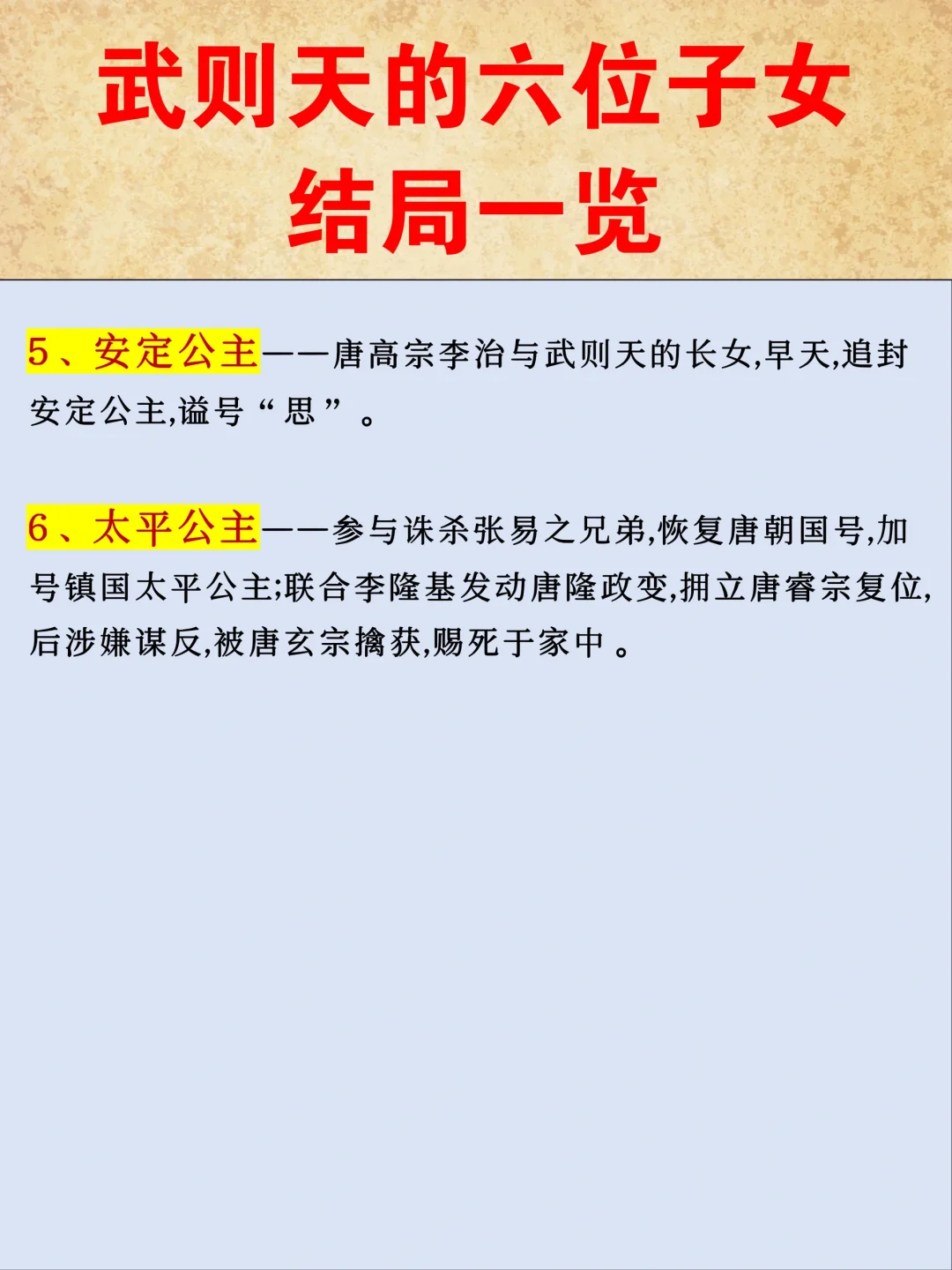 🤴武则天,身为一代女皇,其执政才能相当卓越,甚至比许多男子做得都要出色,然而,从母亲这个角度来看,她无疑是失败的。 👉武则天总共育有六个子女,这些子女本应生长于皇家,理应具备超凡的能力与才华。 👉但令人惋惜的是,他们要么是因为各种各样的原因而没能充分地展现出自身的价值,要么就是没能获得一个好的结局。