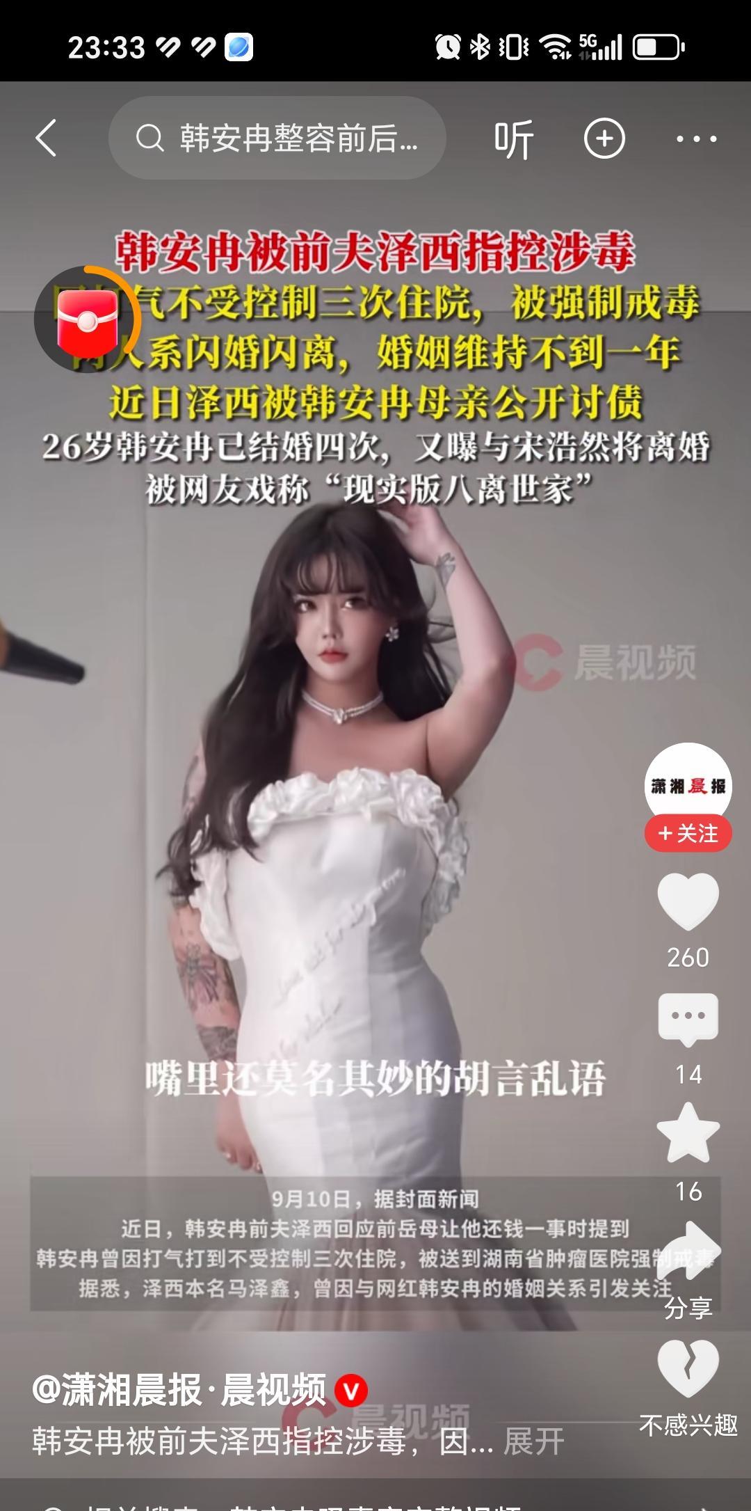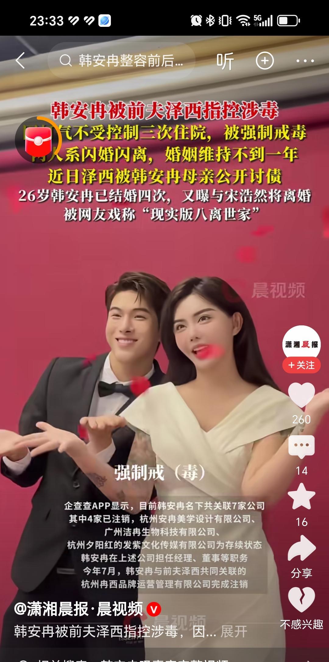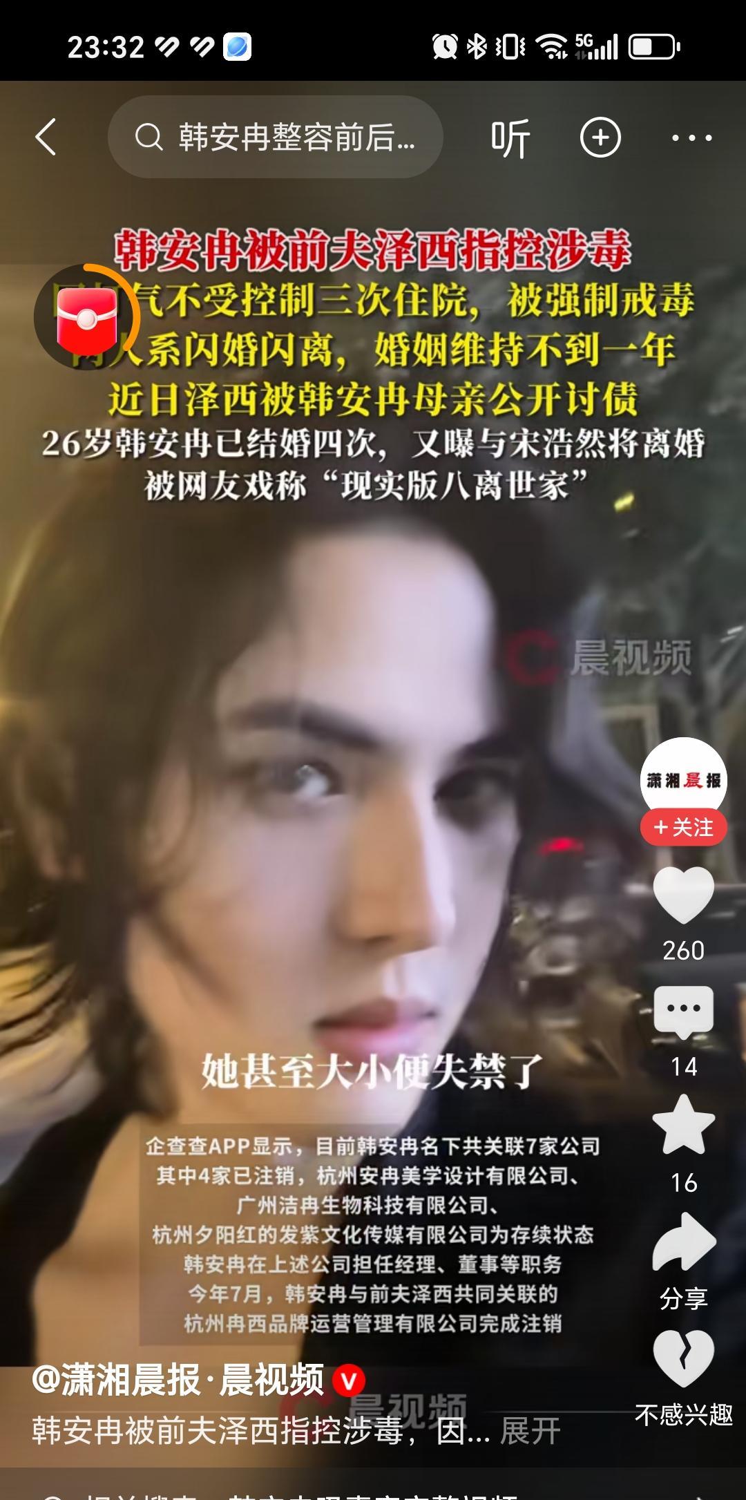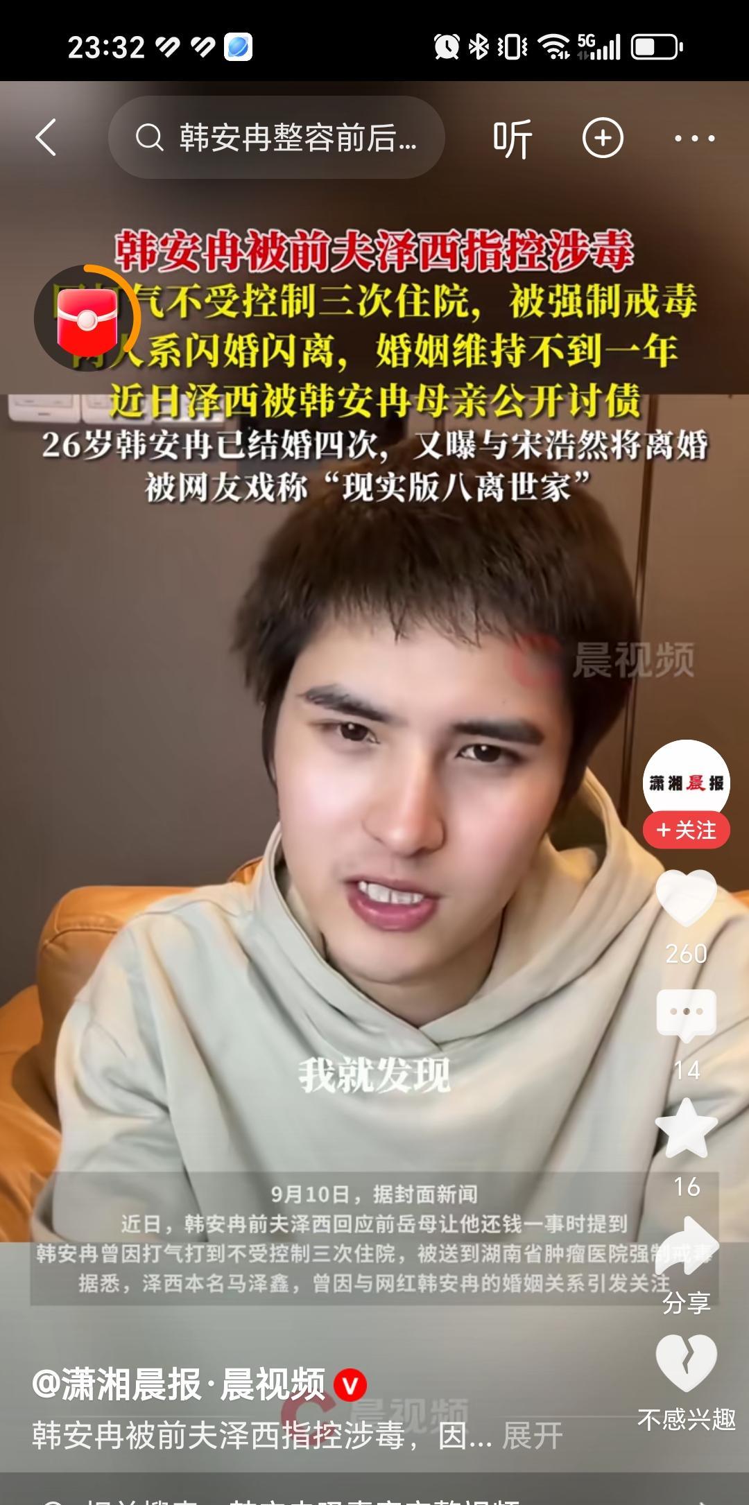 9月10日韩安冉前夫出来锤他吸毒,这四婚还在离婚中的没锤他,这个离了好长时间的一婚出来说韩安冉了。 两人结婚一年韩安冉三次住院还被强制戒毒。 说实话韩安冉吸毒这几任老公都知道吧,都没有拿出来说,说明韩安冉情绪不稳定,经常情绪在直播间就不受控制。但是看男人还行至少都四离了才爆出来吸毒。 这个泽西应该是和韩安冉最后的公司都注销了,而且被韩安冉母亲公开讨债惹火了,要不也不会说韩安冉的吸毒。 我只能说最了解自己的人就是枕边人,所以韩安冉真的吸毒就不要直播,带货了,教坏年轻人。 如果韩安冉真的像前夫说的那样真的直播生涯到头了