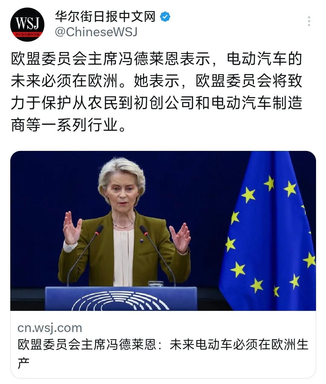 《华尔街日报》中文网今晚(9月10日)报道:“欧盟委员会主席冯德莱恩表示,未来的电动汽车必须在欧洲生产。她表示,欧盟委员会将致力于保护农民到初创公司和电动汽车制造商等一系列行业。” 在慕尼黑举行的国际汽车展上,德国媒体称是德国汽车和中国汽车的对决时刻。中国是电动汽车行业中唯一具有完全产业链的国家,让德国汽车如何对决?所以冯德莱恩急了,要求在欧洲销售的电动汽车必须是欧洲产,原来加征关税即可,现在准备直接将中国产品拒之门外。如果中国电车厂家去欧洲投资建厂,欧盟则要求必须交出整车及锂电池生产技术,这就是欧盟在赤裸裸地搞贸易保护主义以及霸道逻辑。现在仅是冯德莱恩的口头表态,如果欧盟出台文件,中方必将进行反制。