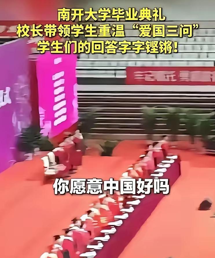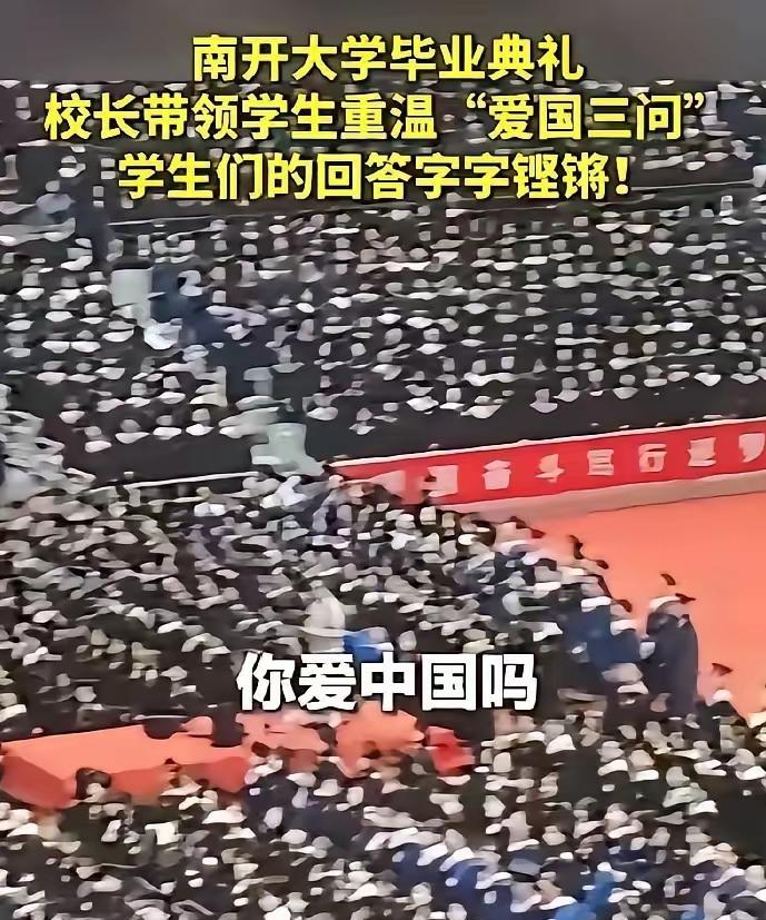 穿越时空的灵魂叩问:你是中国人吗?你爱中国吗?你愿意中国好吗?这是南开大学首任校长张伯苓在开学典礼上发出的“爱国三问”!这振聋发聩的声音,瞬间点燃了抗战时期青年学生的爱国热情! 校长是学校的灵魂!都说,有什么样的校长就有什么样的学校!就会培养出什么样的学生!所以选对校长,学校才能长久不衰,不断发展! 此时此刻,联想到武汉大学的种种怪现象,真的让人不寒而栗!如果再不整治,武汉大学将走向何处? 由此感觉,每所小学,每所中学,每所大学都应该进行这三问,爱国教育时刻不能放松!