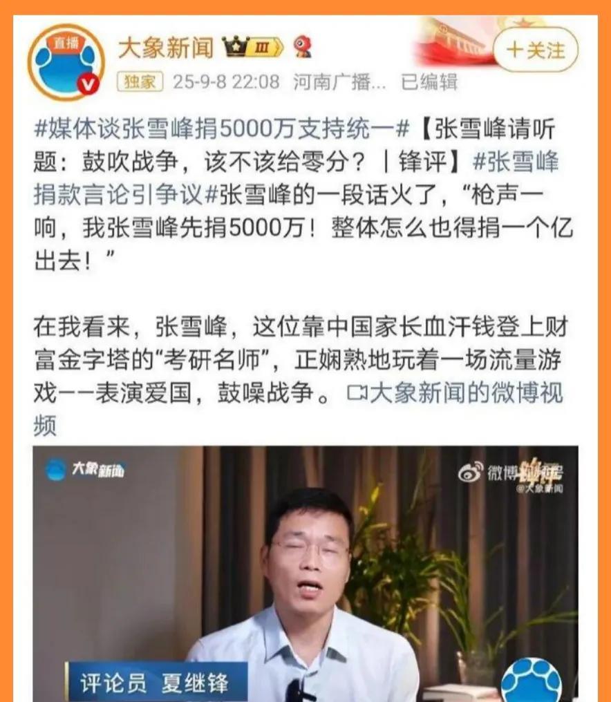 九三大阅兵之后,妄图扳回一城的境外敌对势力和1450,在网上“朝阳群众”的齐声声讨下,一众牛鬼蛇神难以招架,纷纷败下阵来,该删帖的删帖,该潜水的潜水。 9月3日阅兵当日,网红张雪峰在演讲时激动地表示,愿为统一大业捐款5000万。于是,社交平台上迅速冒出一些牛鬼蛇神对他口诛笔伐。尤其是《大象新闻》,竟出动七名编辑联合发文批判张雪峰。 《大象新闻》称张雪峰是“表演爱国,鼓噪战争”,然而《大象新闻》的一些观点荒谬至极,比如将“武统”解读为“针对中国同胞”。 特别是将“收台”与“侵略别国领土”相挂钩,引发网友强烈不满。大家纷纷撰文痛批这种无知且错误的言论。面对舆论的惊涛骇浪,《大象新闻》再次紧急删文并封禁评论区。 #九三阅兵#