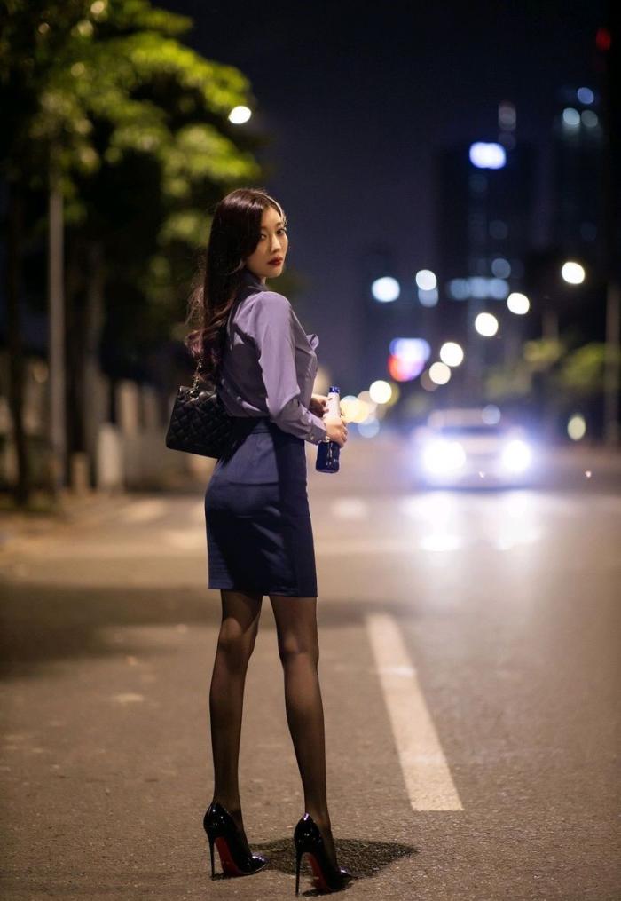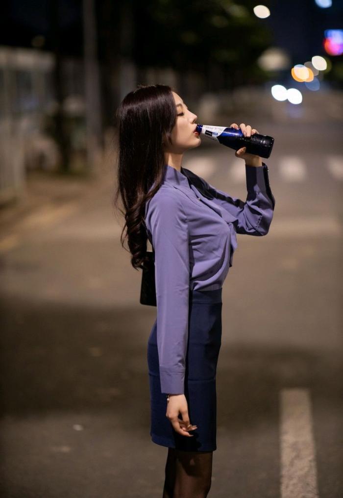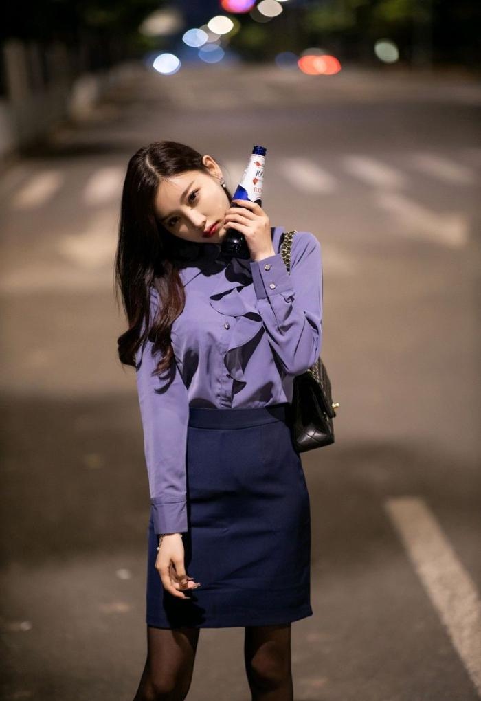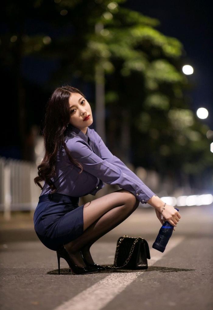 她站在路灯下,手中拿着一瓶饮料,灯光在她身上投下斑驳的影子。那套紧身职业装,在夜晚的氛围里,少了几分白天的拘谨,多了几分随性与妩媚。黑丝与职业装的组合,是一种大胆又巧妙的尝试,将职场的干练与女性的柔美性感融合得恰到好处,这也是杨晨晨穿搭的独特之处,总能在不同场景里,找到最适合自己且最具吸引力的搭配方式。